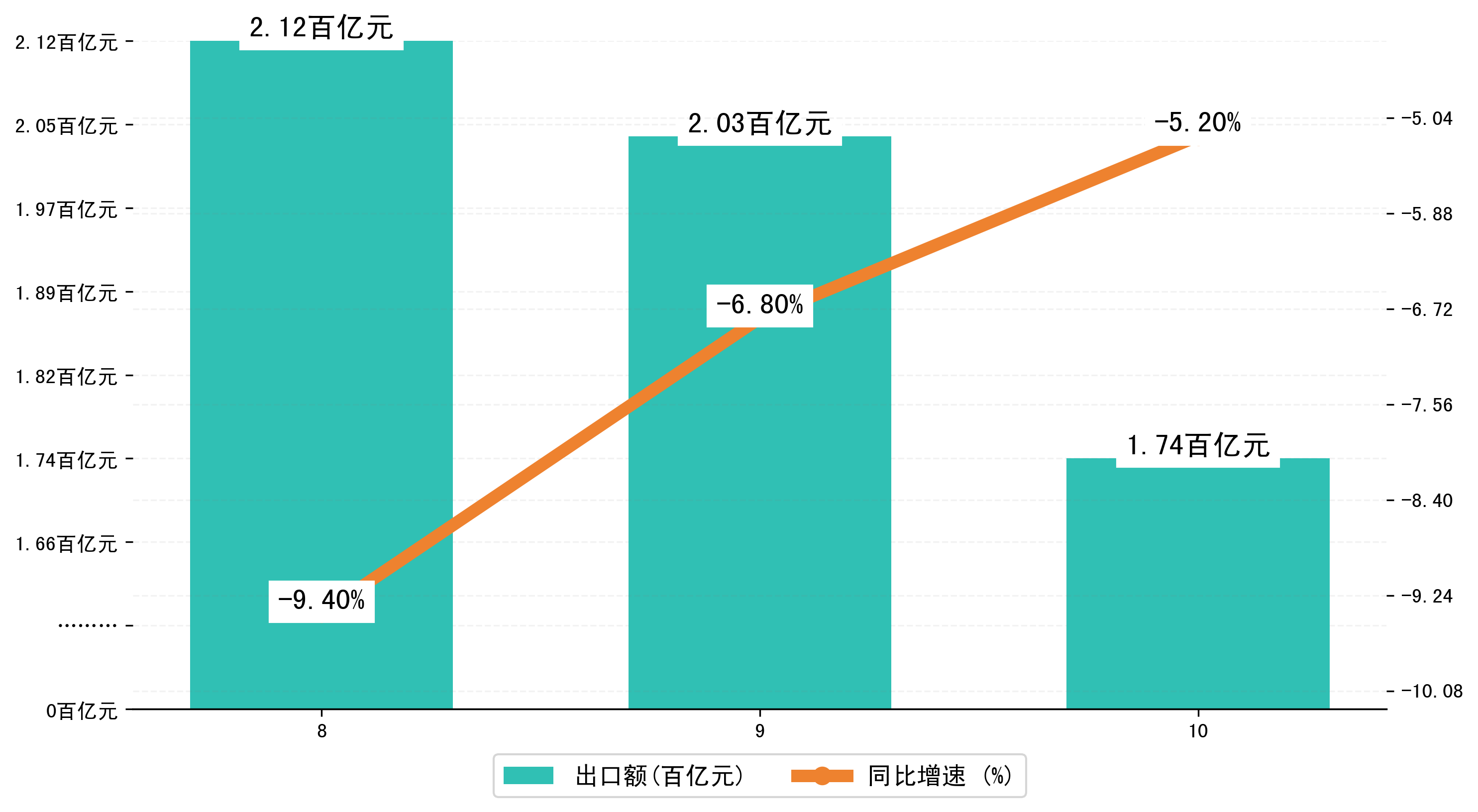 以美元计,2023年1-10月中山市出口额为259,6499.8659万美元,相比上年同期减少了42,1142.5754万美元,同比减少-11.20%。