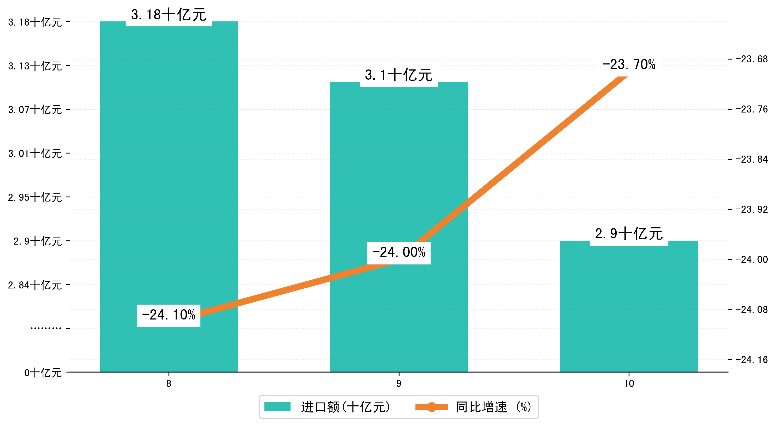 以人民币计,2023年10月中山市进口额为28,9512.2685万元,相比上月减少了2,0850.2615万元;相比上年同期减少了7,5056.6178万元,同比减少了-23.70%。