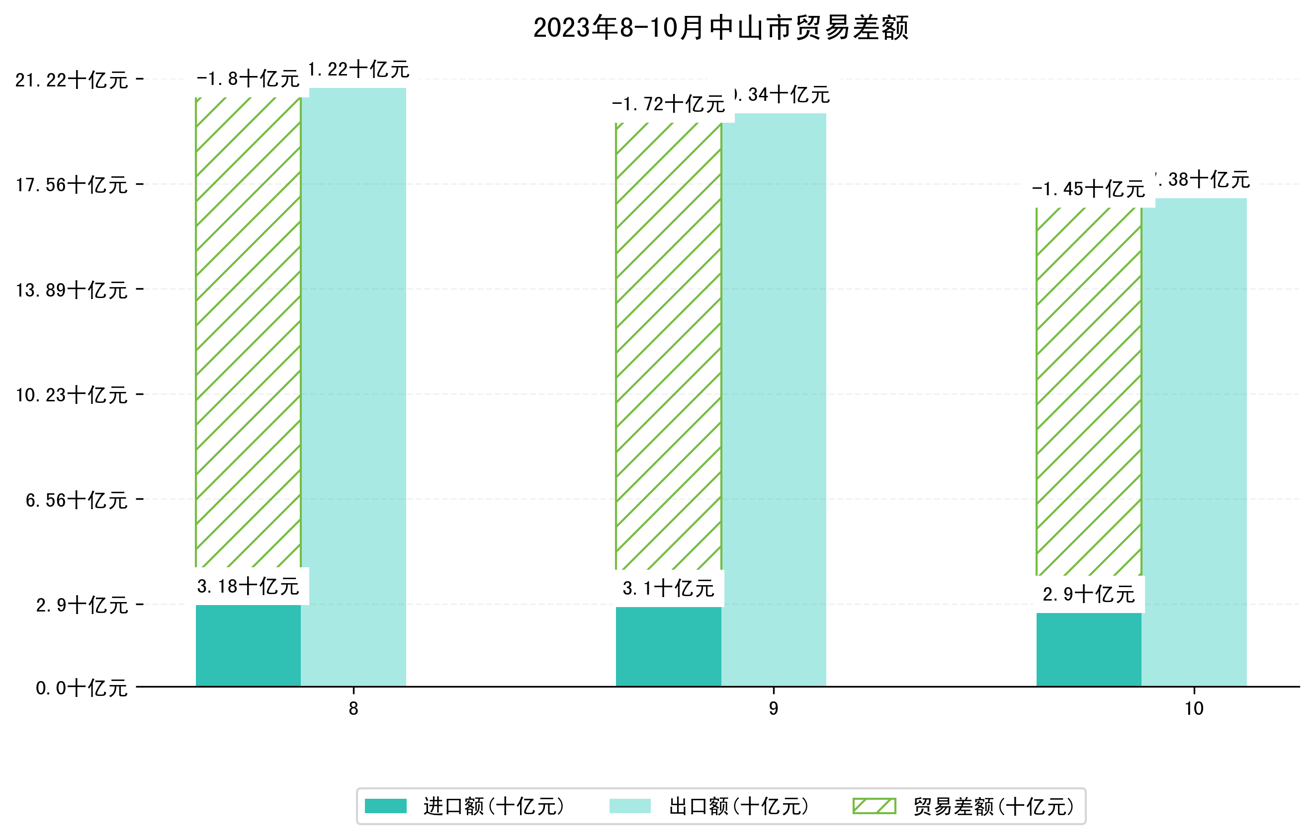 以人民币计,2023年10月中山市贸易差额为144,8838,0883万元(贸易顺差),相比上月减少了27,5219,4527万元,即3,8063,9983万美元;相比上年同期增加了28,9880,8866万元,同比增加25.01%。