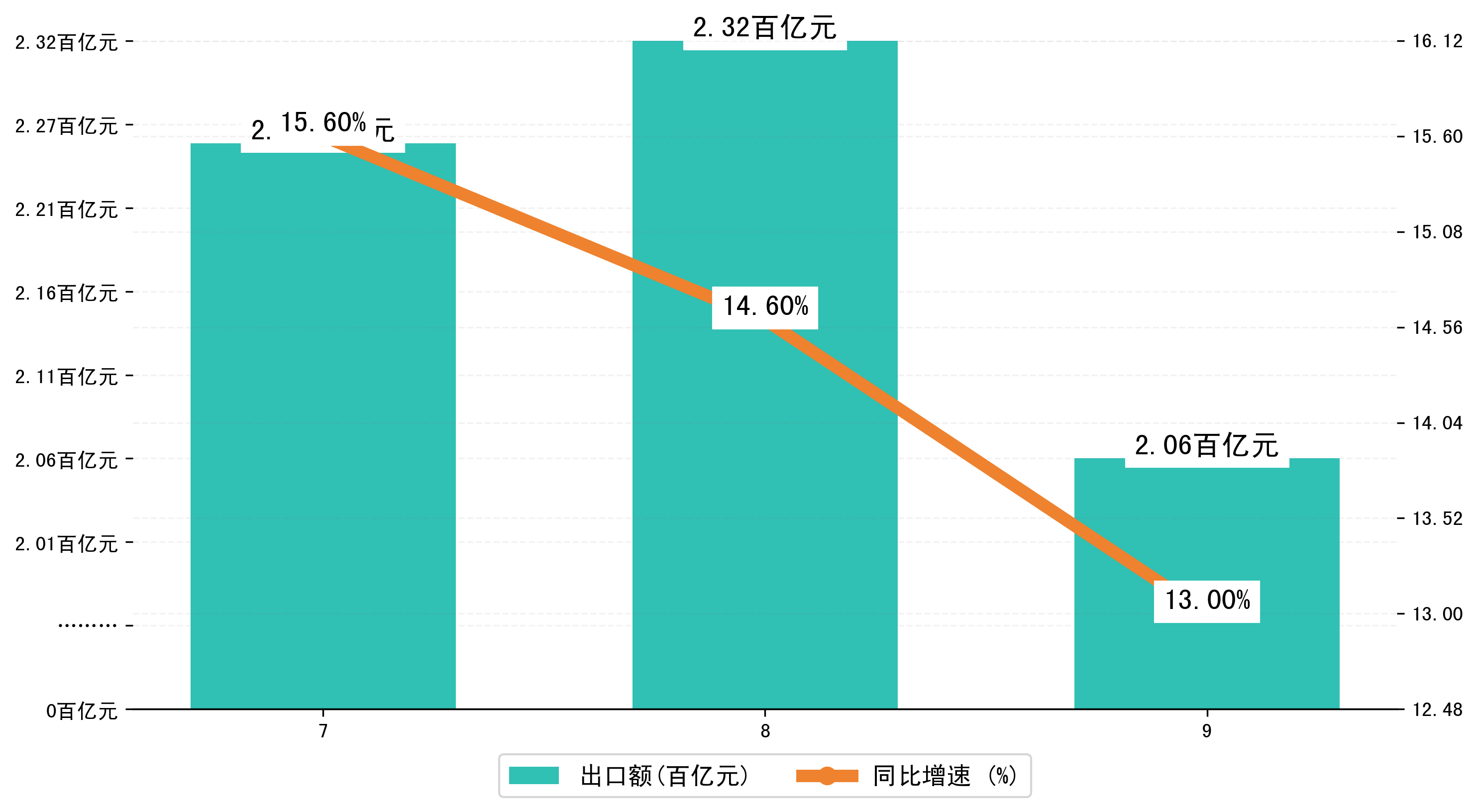 以美元计,2024年1-9月中山市出口额为261,3315.6795万美元,相比上年同期增加了25,8826.1607万美元,同比增加11.00%。