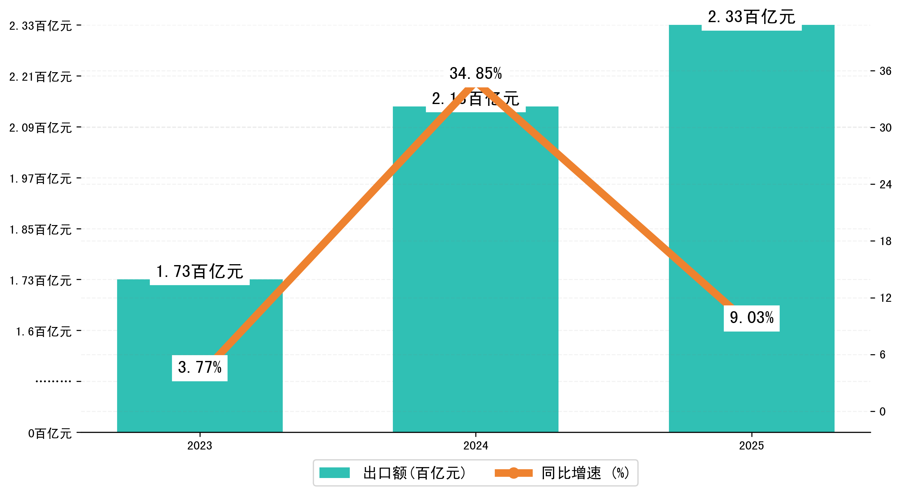 以美元计,2025年1-1月中山市出口额为32,3565.3282万美元,相比上年同期增加了2,3331.3452万美元,同比增加7.90%。
