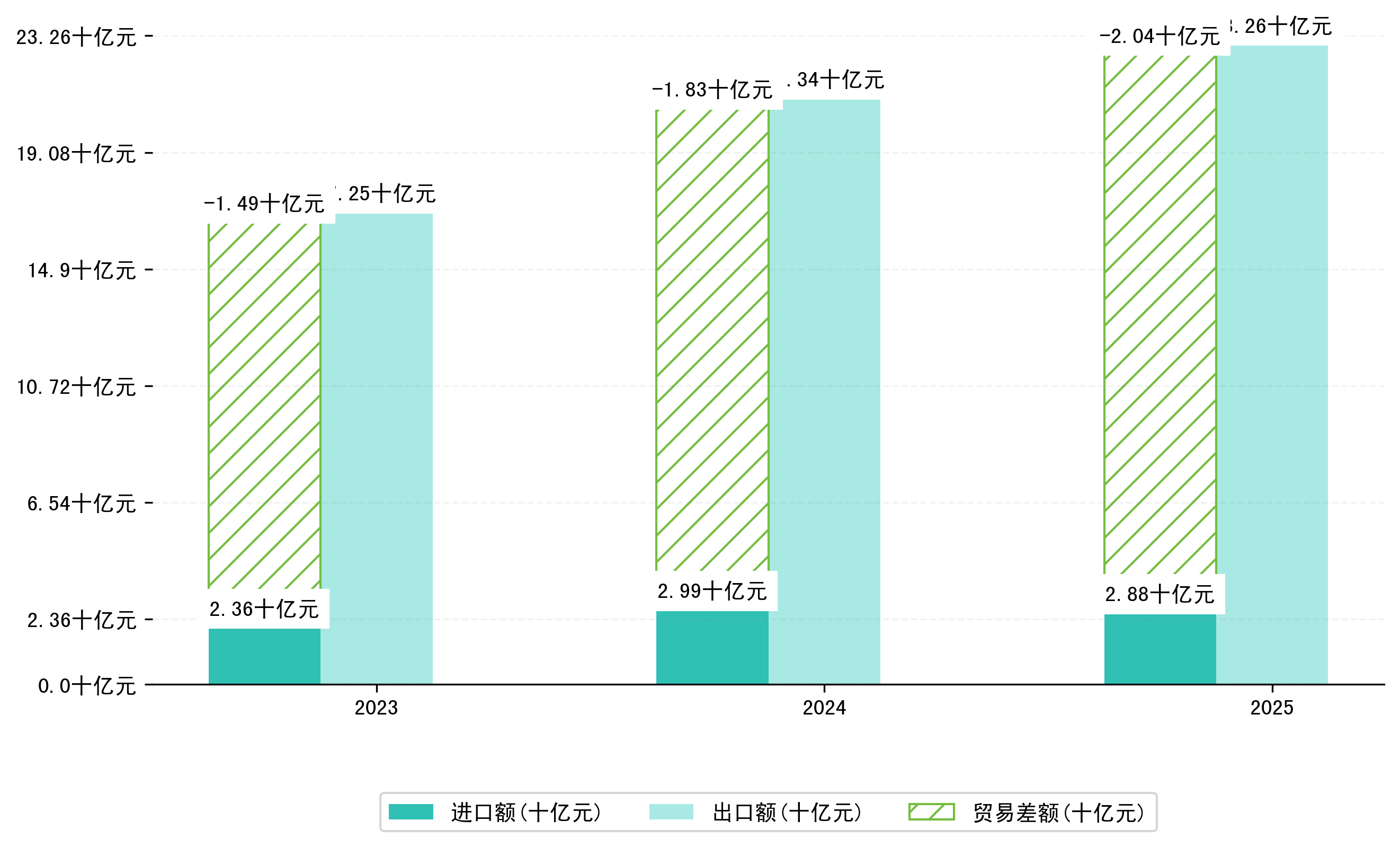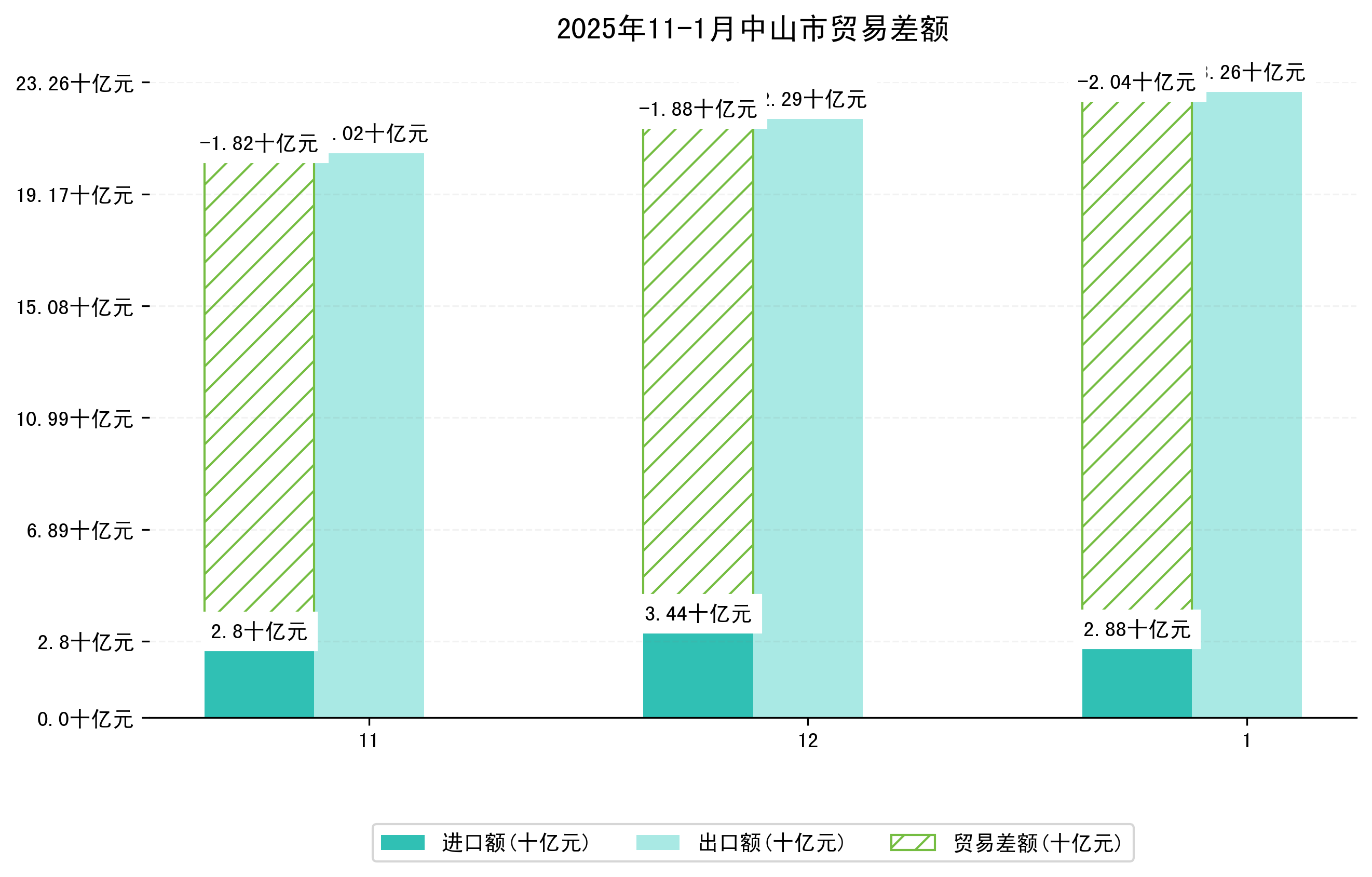 以美元计,2025年1-1月中山市贸易差额为28,3566,9570万美元(贸易顺差),相比上年同期增加了2,5504,1568万美元,同比增加9.88%。