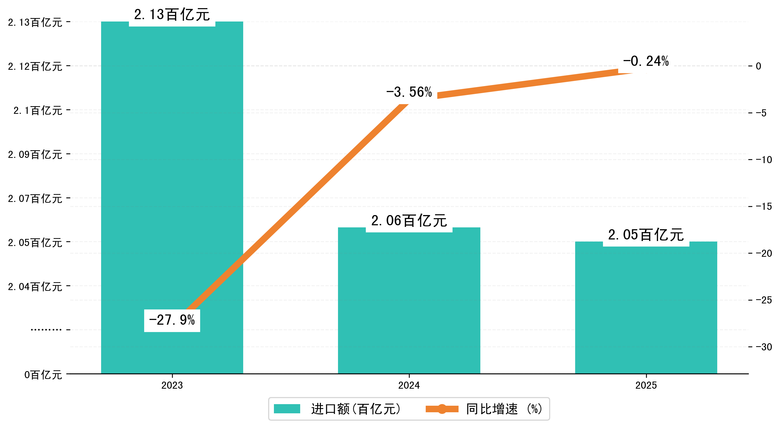 以美元计,2025年1-7月中山市进口额为28,6051.447万美元,相比上年同期减少了3830.2091万美元,同比减少-1.30%。