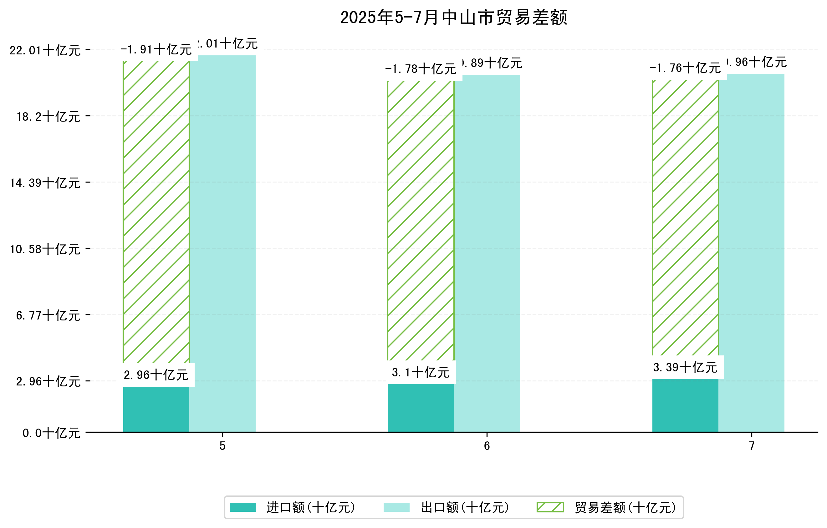以美元计,2025年1-7月中山市贸易差额为176,1899,7559万美元(贸易顺差),相比上年同期增加了5,2191,7344万美元,同比增加3.05%。