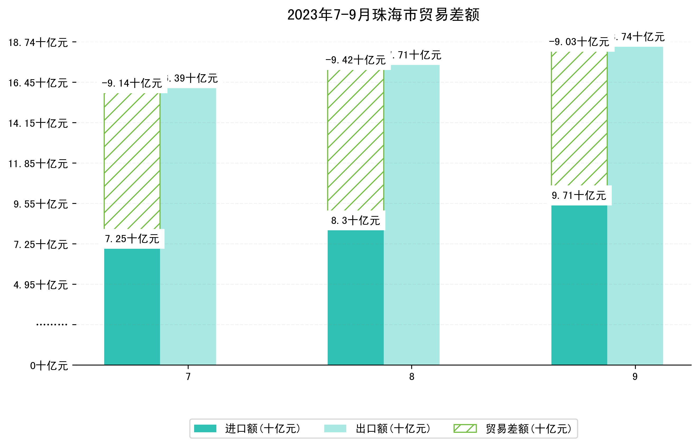 以人民币计,2023年1-9月珠海市贸易差额为799,2795,1058万元(贸易顺差),相比上年同期增加了203,1099,6718万元,同比增加34.07%。
