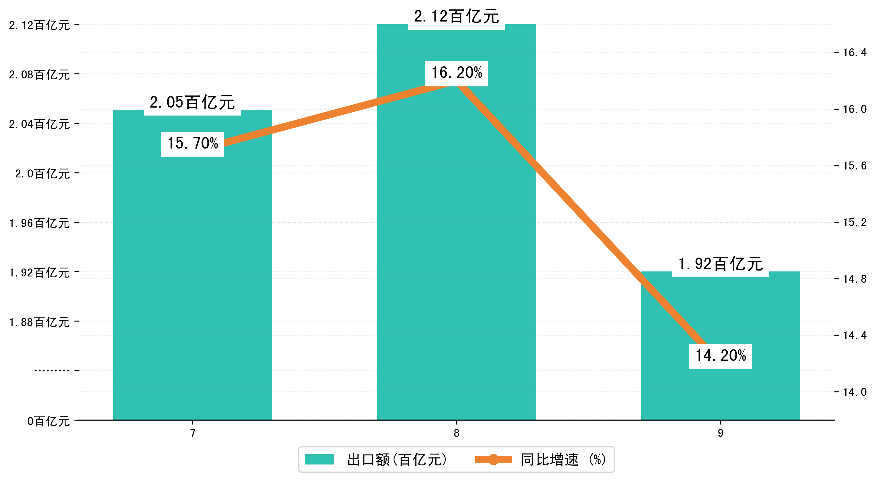 以人民币计,2024年9月珠海市出口额为192,1531.8358万元,相比上月减少了19,6176.481万元;相比上年同期增加了4,7073.2268万元,同比增加了14.20%。