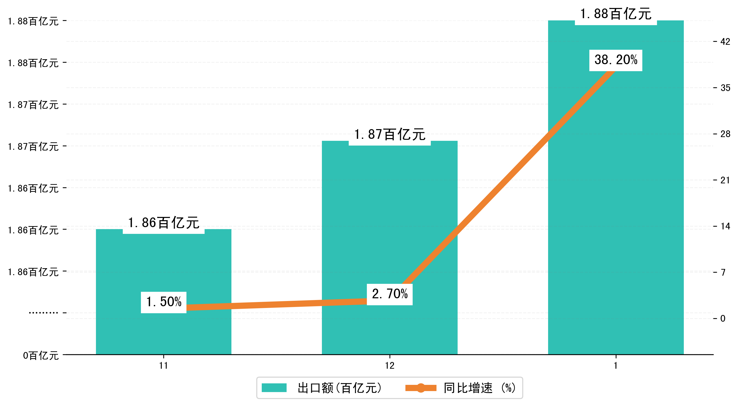 以人民币计,2024年1月珠海市出口额为188,3206.0342万元,相比上月增加了1,3342.3203万元;相比上年同期增加了53,5787.2759万元,同比增加了38.20%。