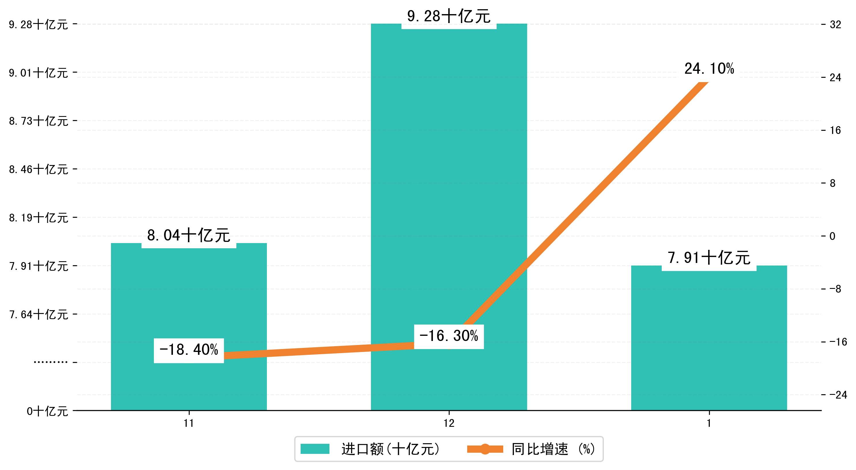 以人民币计,2024年1-1月珠海市进口额为79,1020.0026万元,相比上年同期增加了16,4132.027万元,同比增加了24.10%。