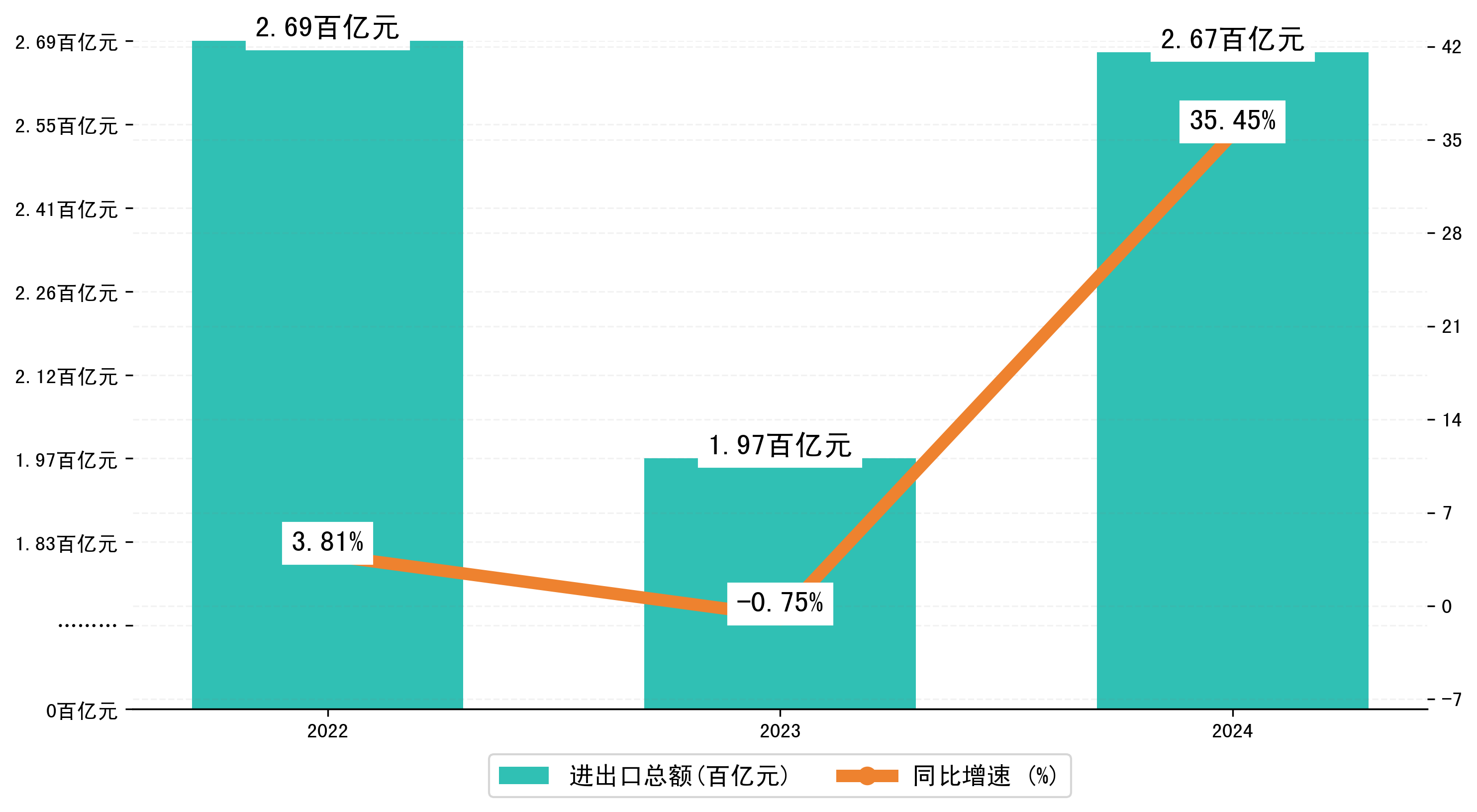 以人民币计,2024年1月珠海市进出口总额为267,4226.0368万元,相比上月减少了12,4081.0952万元;相比上年同期增加了69,9919.3028万元,同比增加了33.70%。