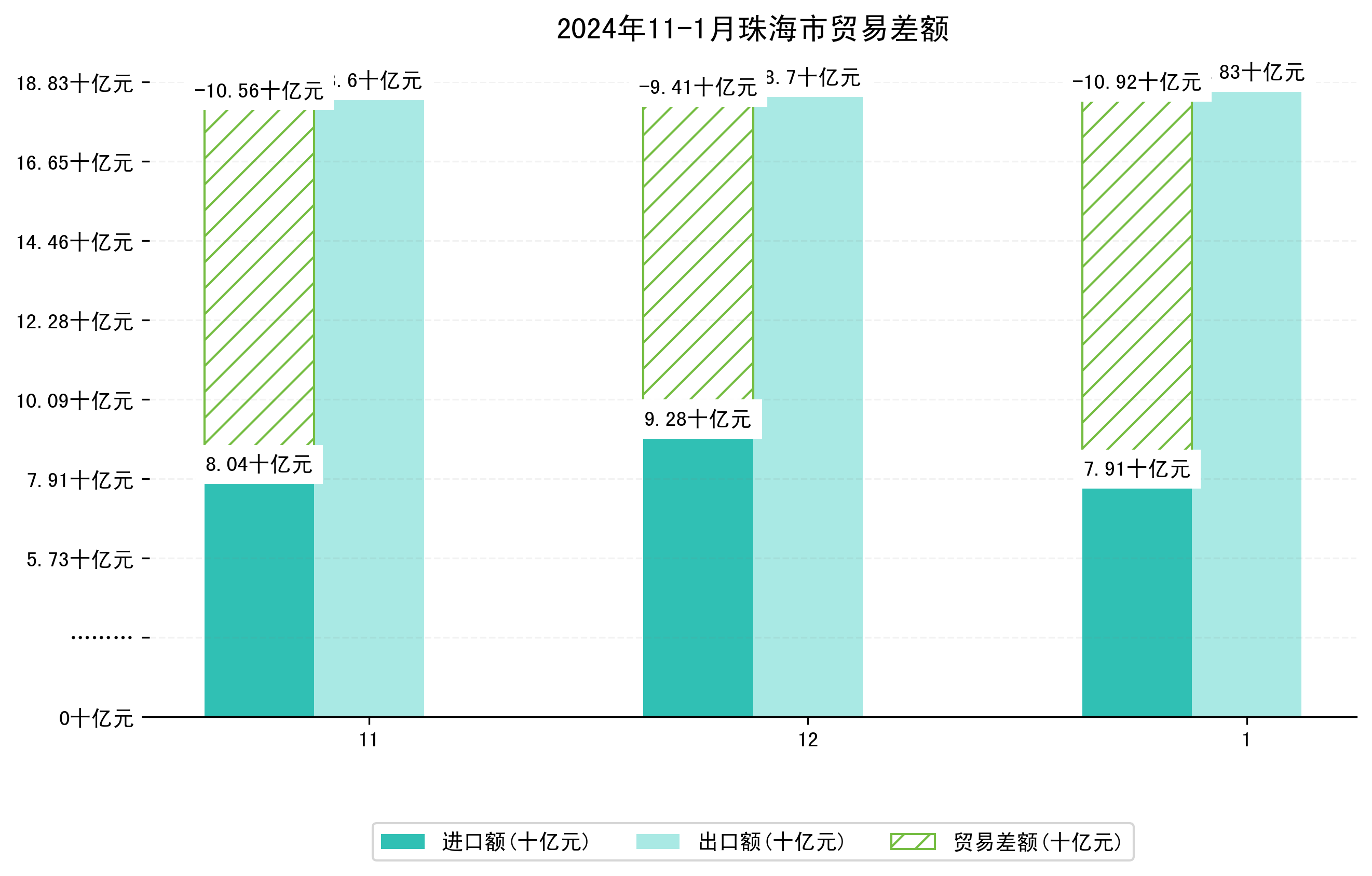 以人民币计,2024年1-1月珠海市贸易差额为109,2186,0316万元(贸易顺差),相比上年同期增加了37,1655,2489万元,同比增加51.58%。