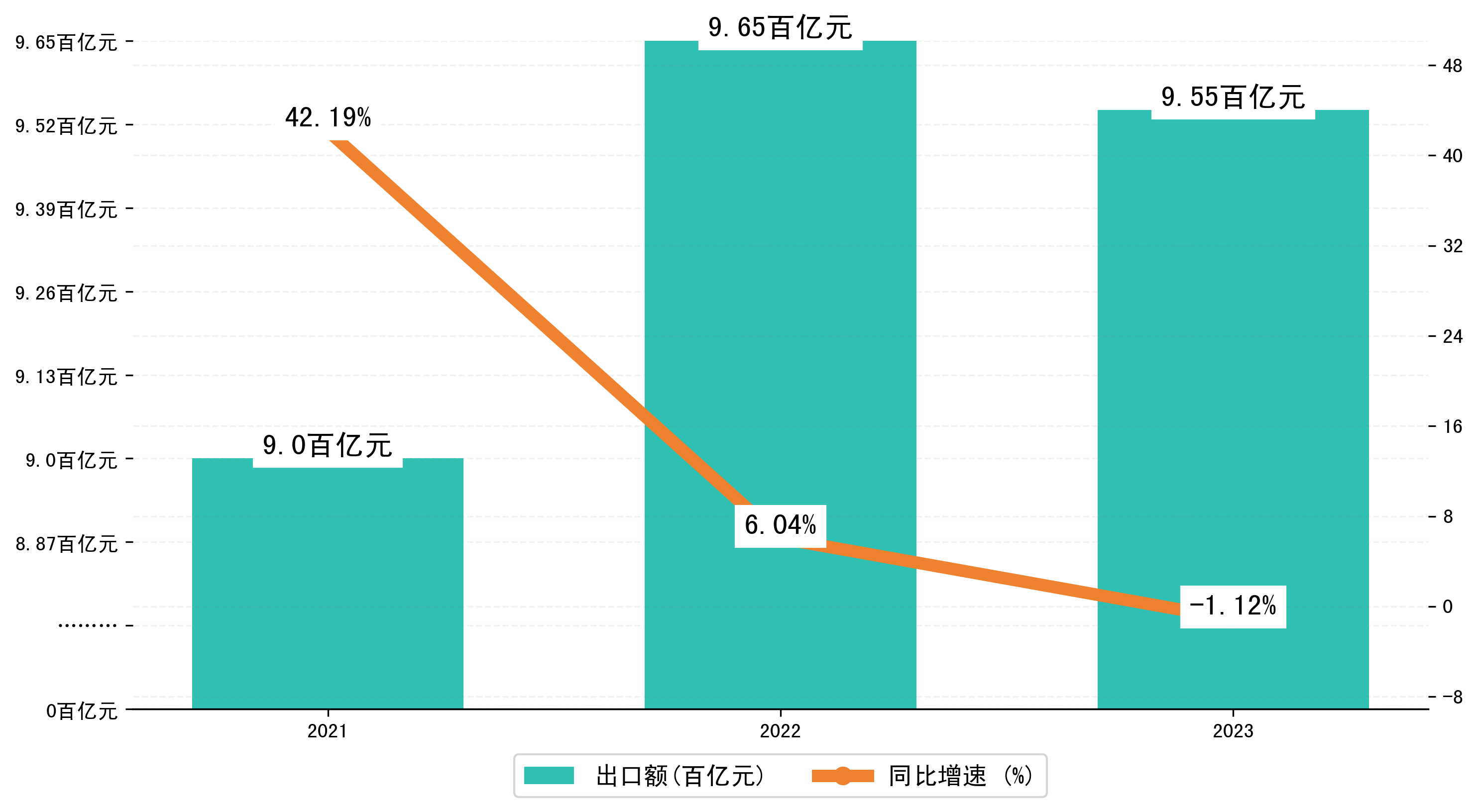 以人民币计,2023年1-6月珠海市出口额为954,5687.8507万元,相比上年同期减少了10,8412.4453万元,同比减少了-1.40%。
