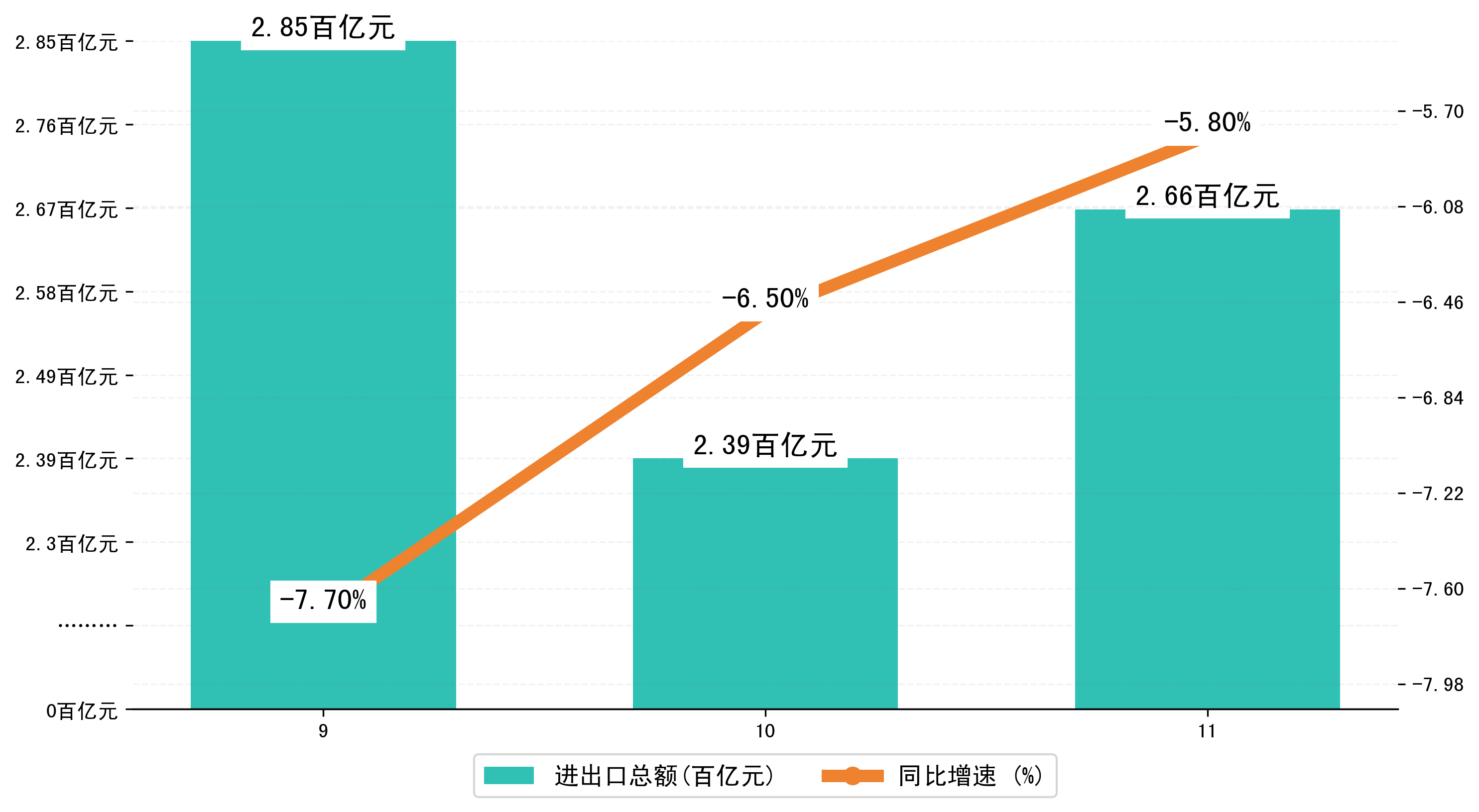 以人民币计,2023年11月珠海市进出口总额为266,3890.8713万元,相比上月增加了26,8901.1378万元;相比上年同期增加了9,0358.442万元,同比减少了-5.80%。