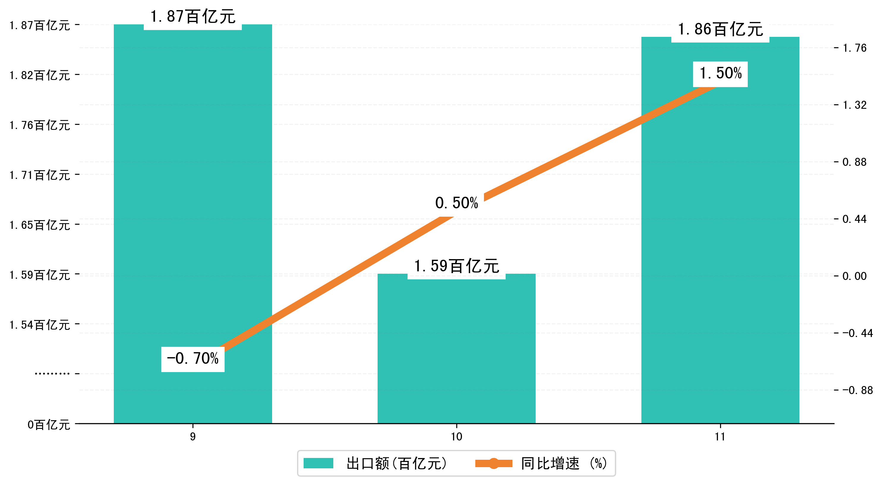 以人民币计,2023年11月珠海市出口额为186,0082.5946万元,相比上月增加了26,7444.6933万元;相比上年同期增加了24,8276.978万元,同比增加了1.50%。