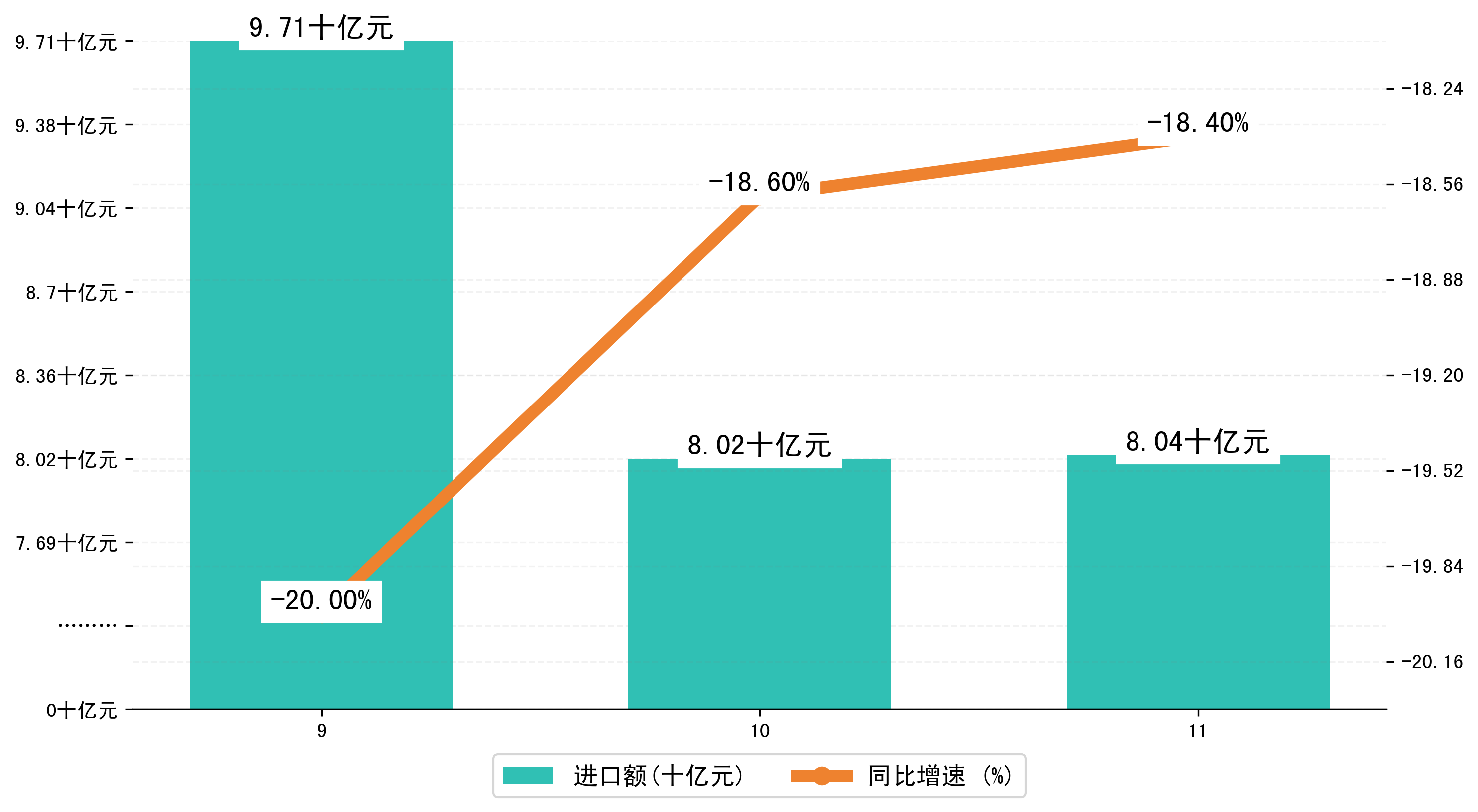 以人民币计,2023年11月珠海市进口额为80,3808.2767万元,相比上月增加了1456.4446万元;相比上年同期减少了15,7918.536万元,同比减少了-18.40%。
