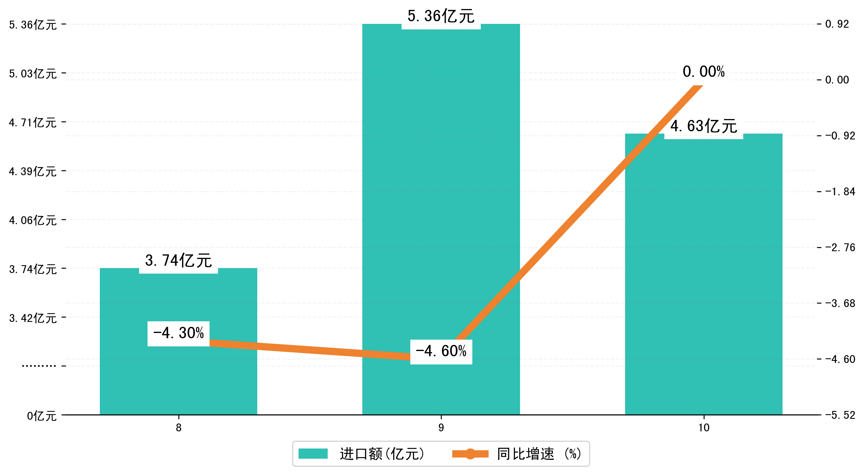 以人民币计,2024年1-10月株洲市进口额为47,4663.5425万元,相比上年同期增加了1,4852.6213万元,同比增加了0.00%。