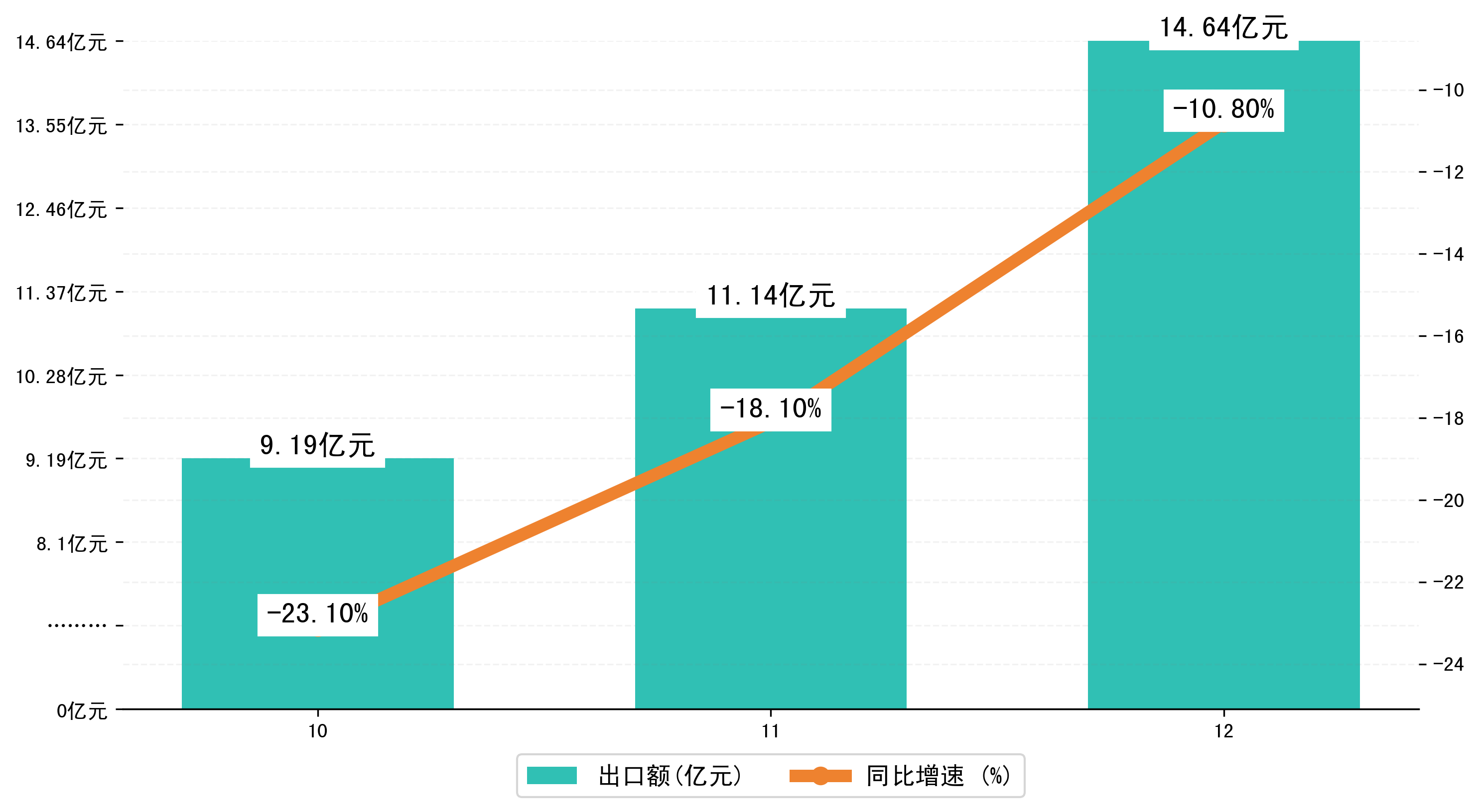以人民币计,2023年1-12月株洲市出口额为140,2683.443万元,相比上年同期增加了24,3701.3049万元,同比减少了-10.80%。