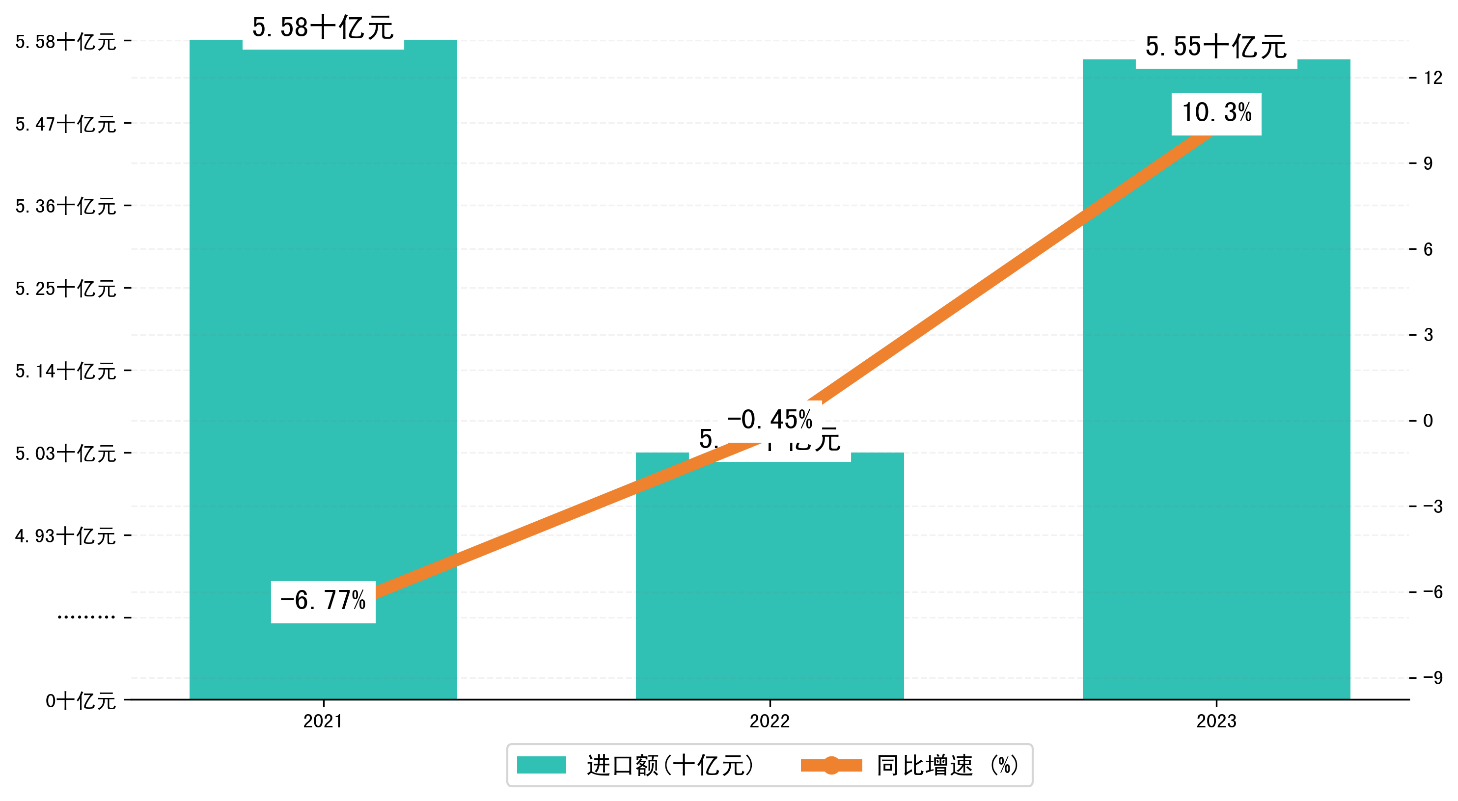 以人民币计,2023年1-12月株洲市进口额为55,5305.2726万元,相比上年同期增加了5,1837.3018万元,同比增加了5.00%。
