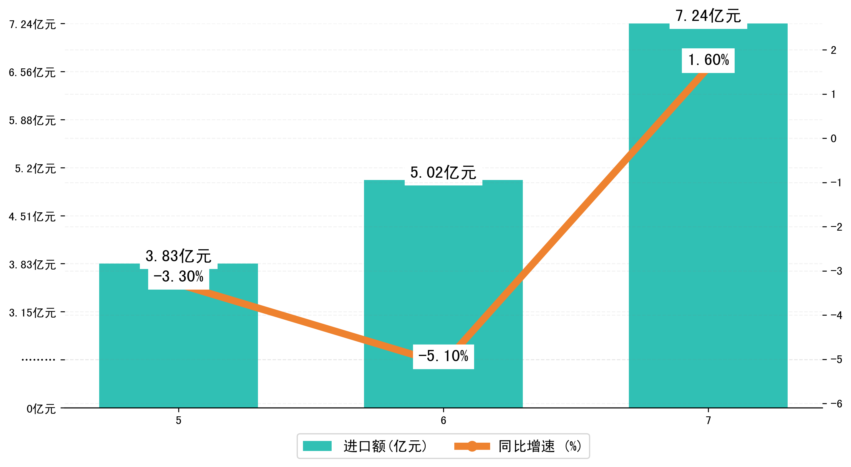 以人民币计,2024年1-7月株洲市进口额为33,7489.3816万元,相比上年同期增加了1,4015.9739万元,同比增加了1.60%。