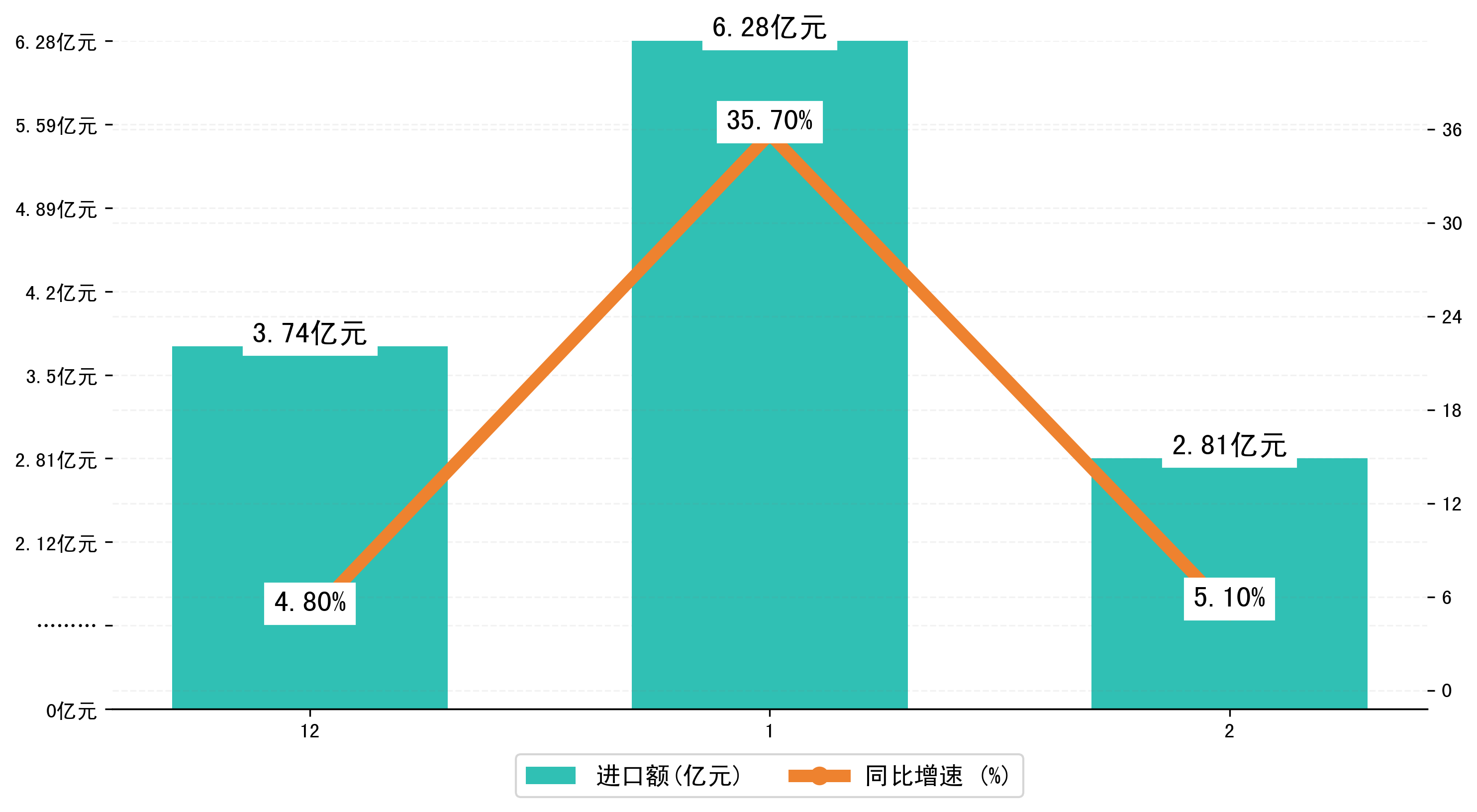 以人民币计,2025年1-2月株洲市进口额为9,0890.7355万元,相比上年同期增加了4516.3989万元,同比增加了5.10%。