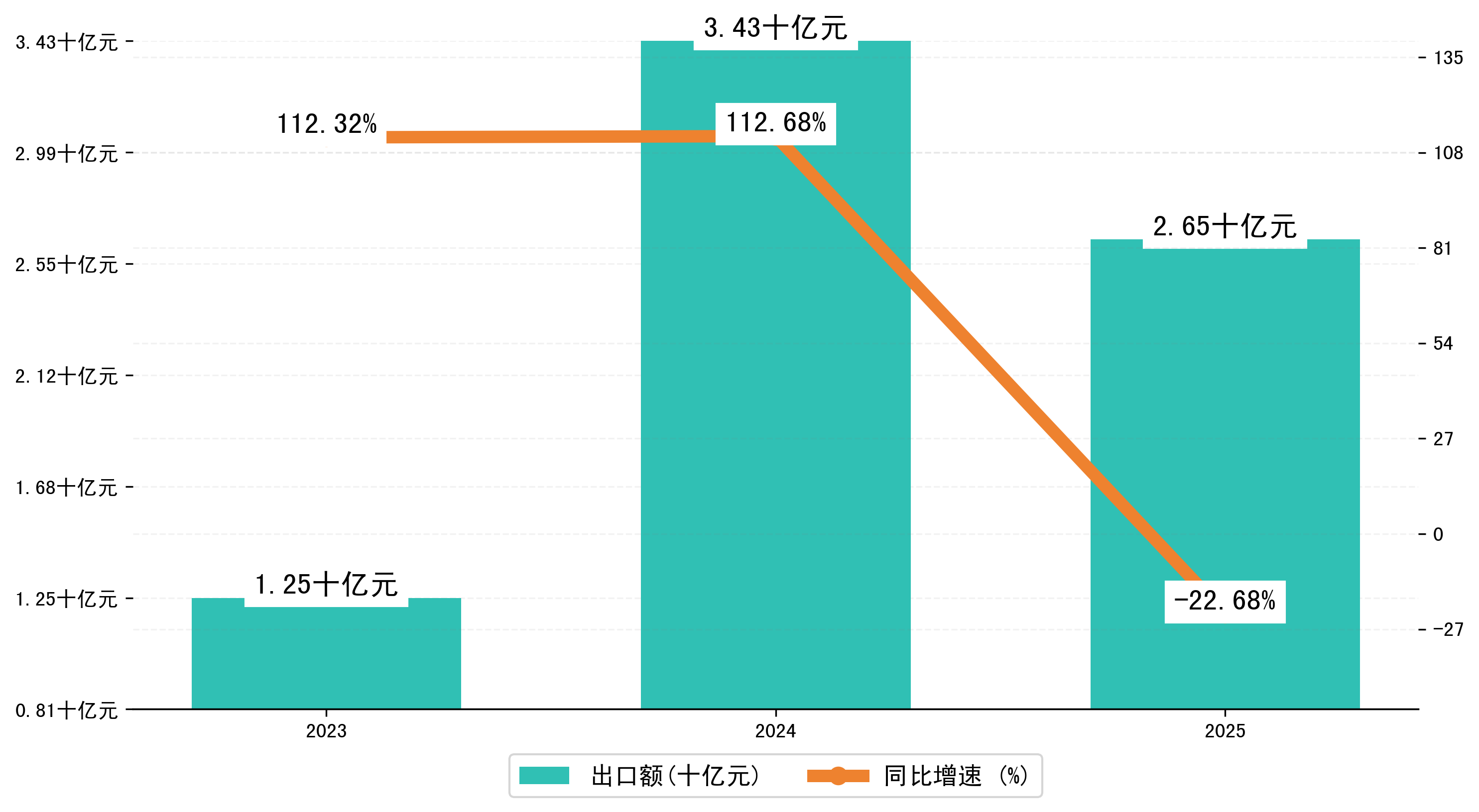 以人民币计,2025年1-2月株洲市出口额为26,4977.0458万元,相比上年同期减少了7,7726.089万元,同比减少了-22.60%。