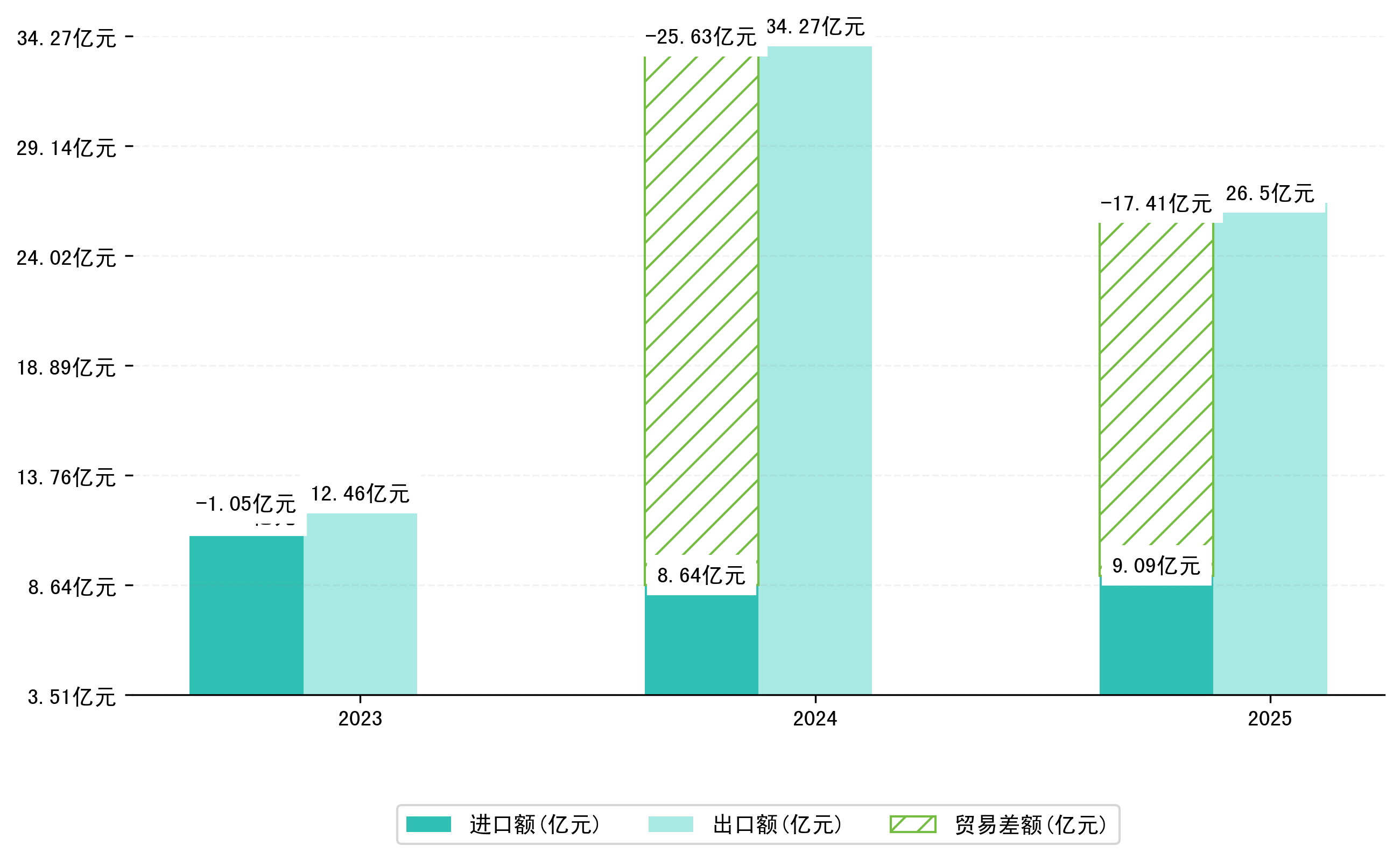以美元计,2025年1-2月株洲市贸易差额为2,4213,7775万美元(贸易顺差),相比上年同期减少了1,1873,7428万美元,同比减少-32.9%。
