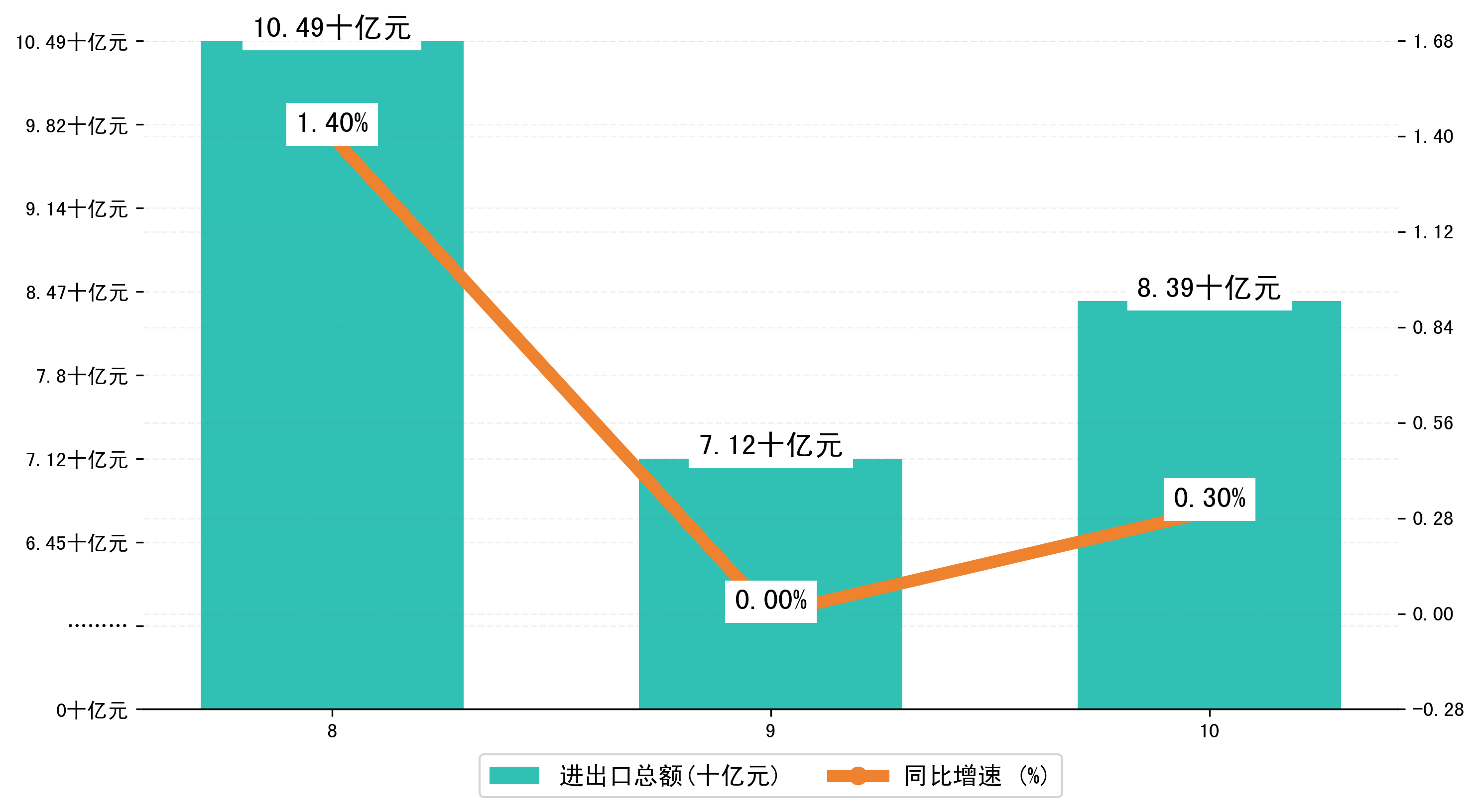 以人民币计,2024年10月淄博市进出口总额为83,9244.8219万元,相比上月增加了12,7055.9329万元;相比上年同期增加了2,9050.5364万元,同比增加了0.30%。