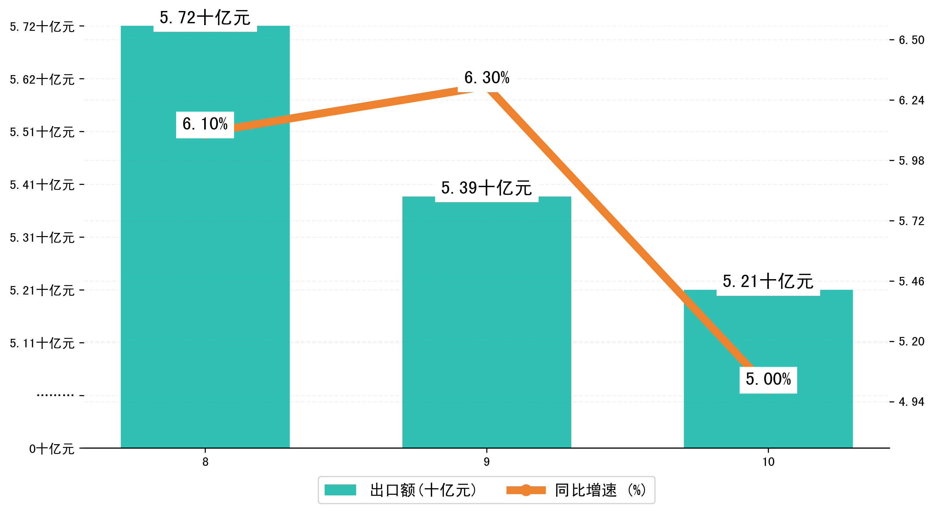 以人民币计,2024年10月淄博市出口额为52,1390.6461万元,相比上月减少了1,7753.6331万元;相比上年同期减少了3,1415.887万元,同比增加了5.00%。