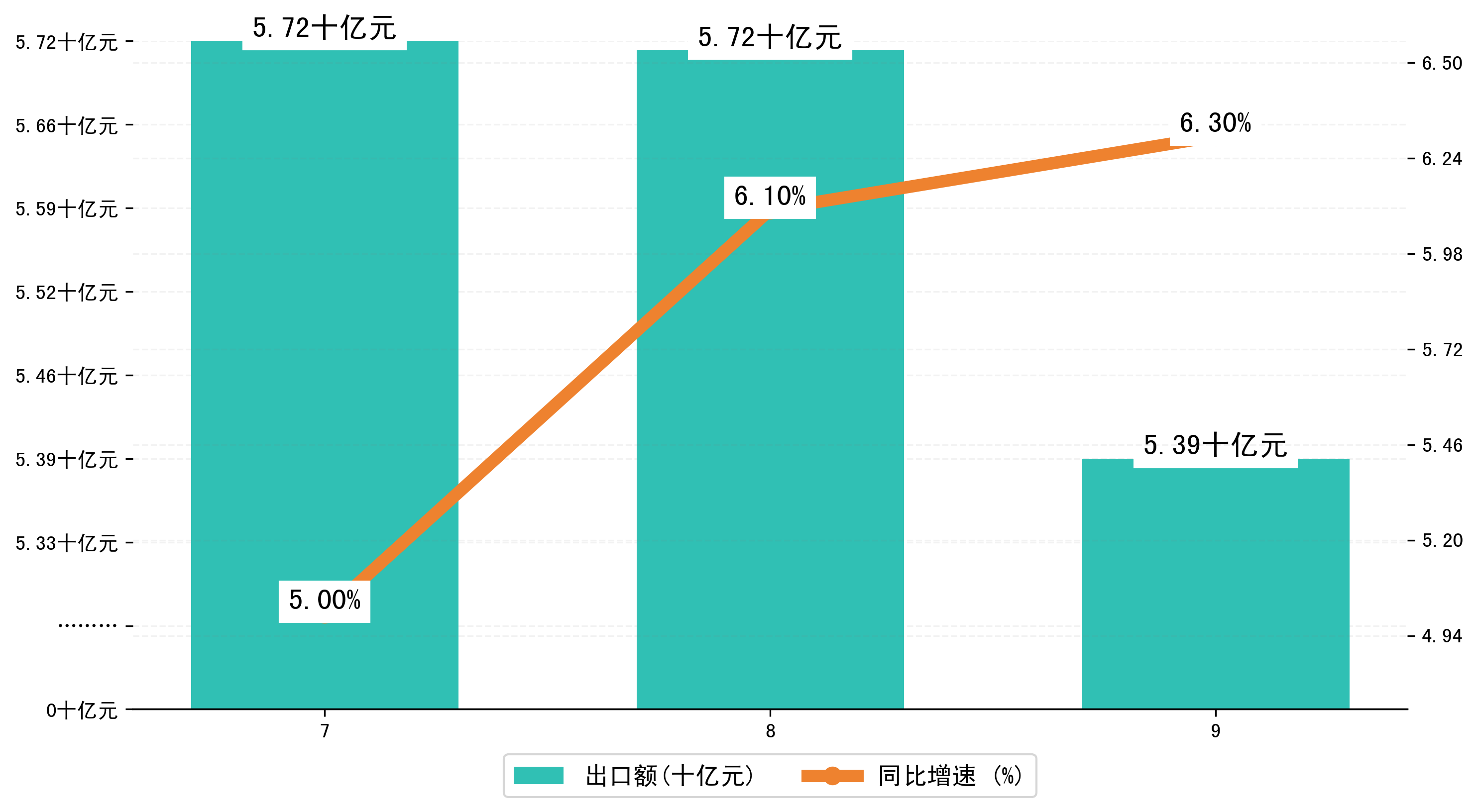 以人民币计,2024年9月淄博市出口额为53,9144.2792万元,相比上月减少了3,2412.2979万元;相比上年同期增加了3,8380.0426万元,同比增加了6.30%。