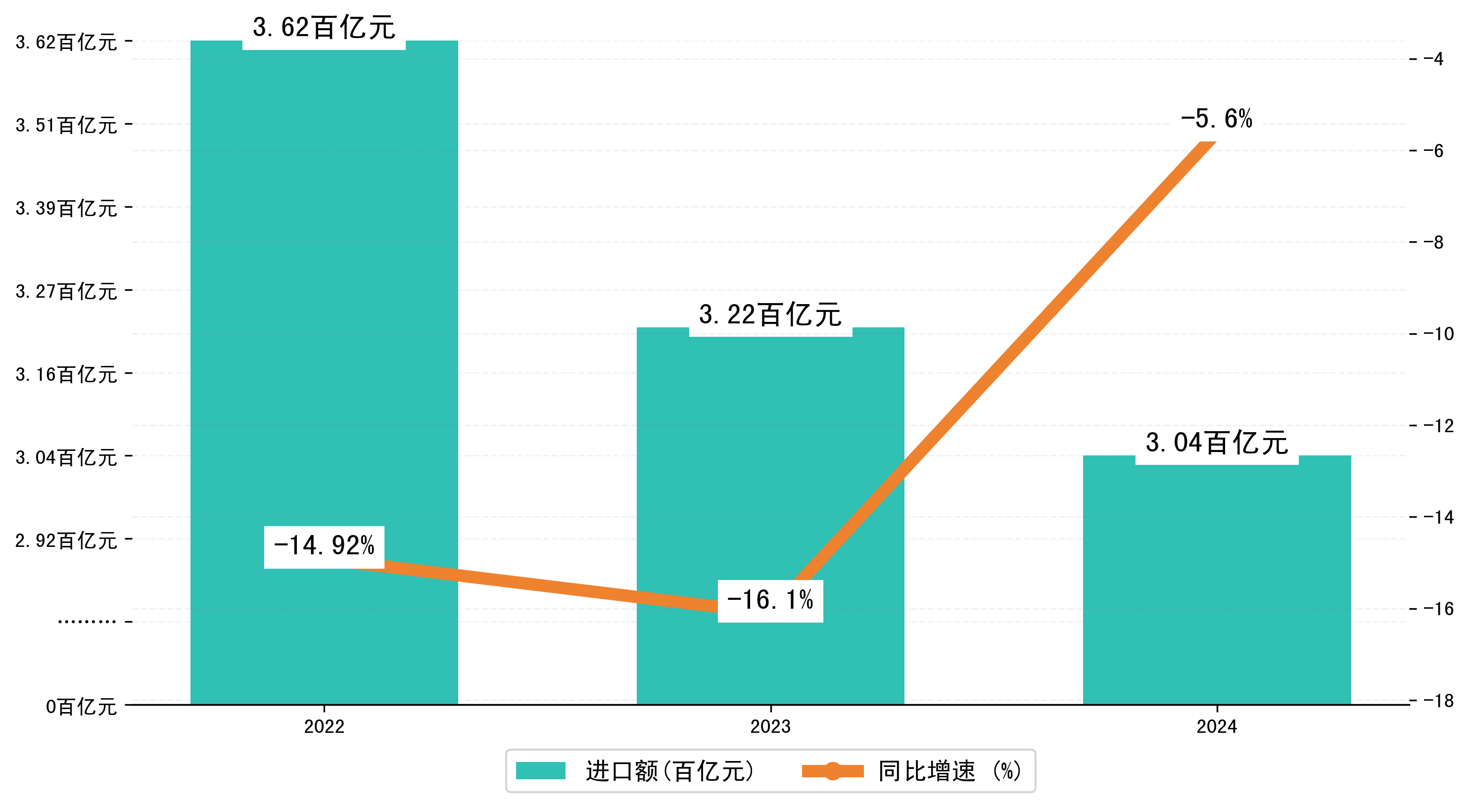 以人民币计,2024年1-9月淄博市进口额为303,8945.8158万元,相比上年同期减少了18,0113.7753万元,同比减少了-8.40%。