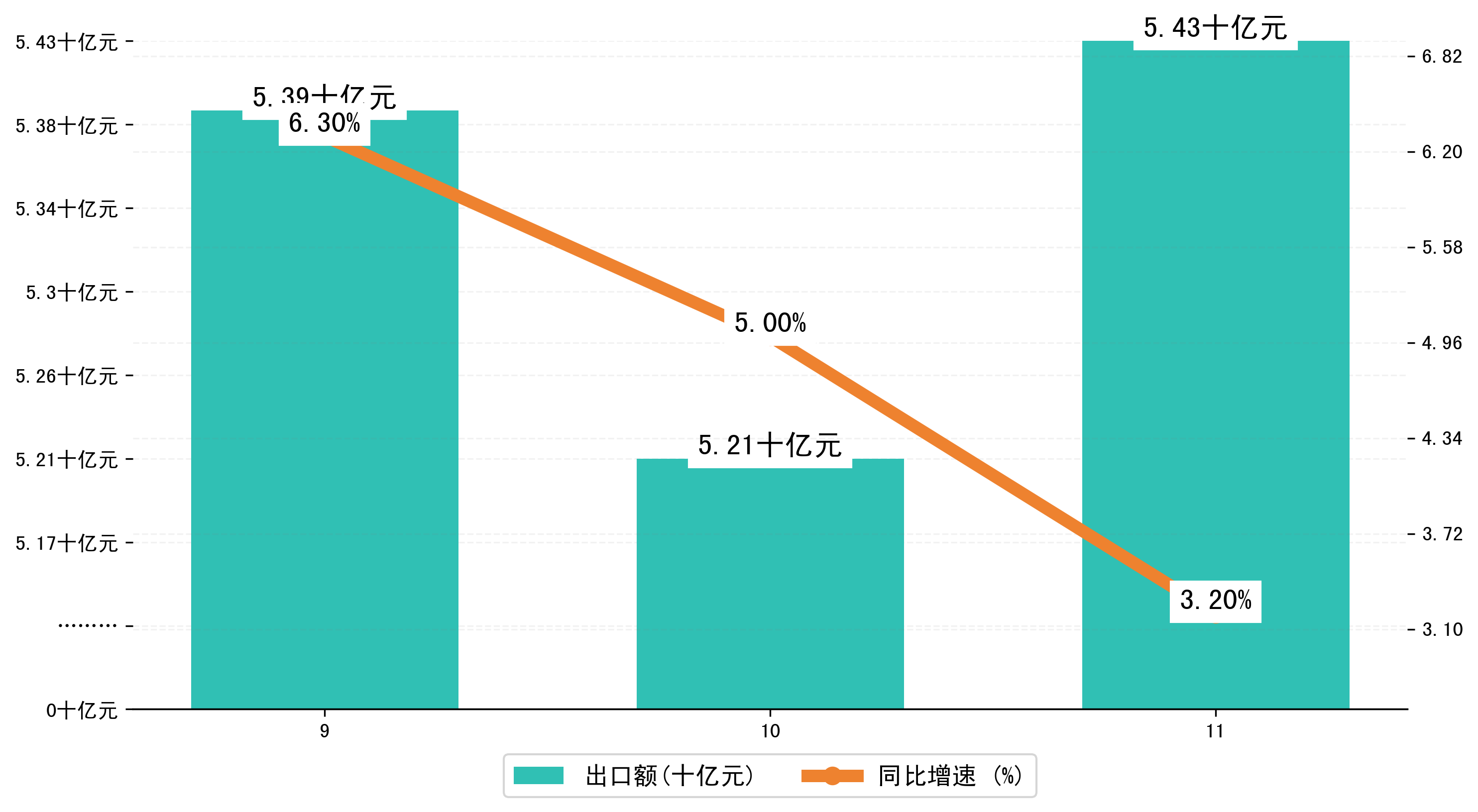 以人民币计,2024年1-11月淄博市出口额为581,9086.1563万元,相比上年同期增加了18,0659.4396万元,同比增加了3.20%。