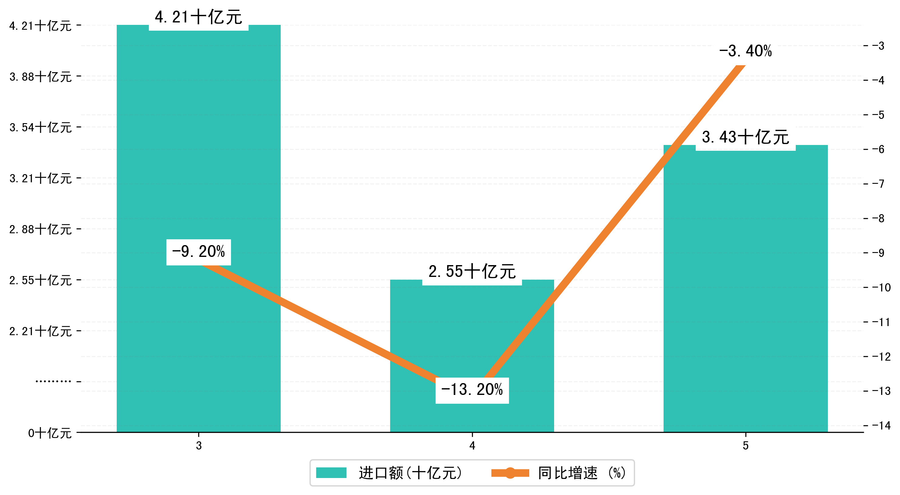 以人民币计,2025年5月淄博市进口额为34,2537.972万元,相比上月增加了8,7825.0814万元;相比上年同期增加了14,5504.1453万元,同比减少了-3.40%。