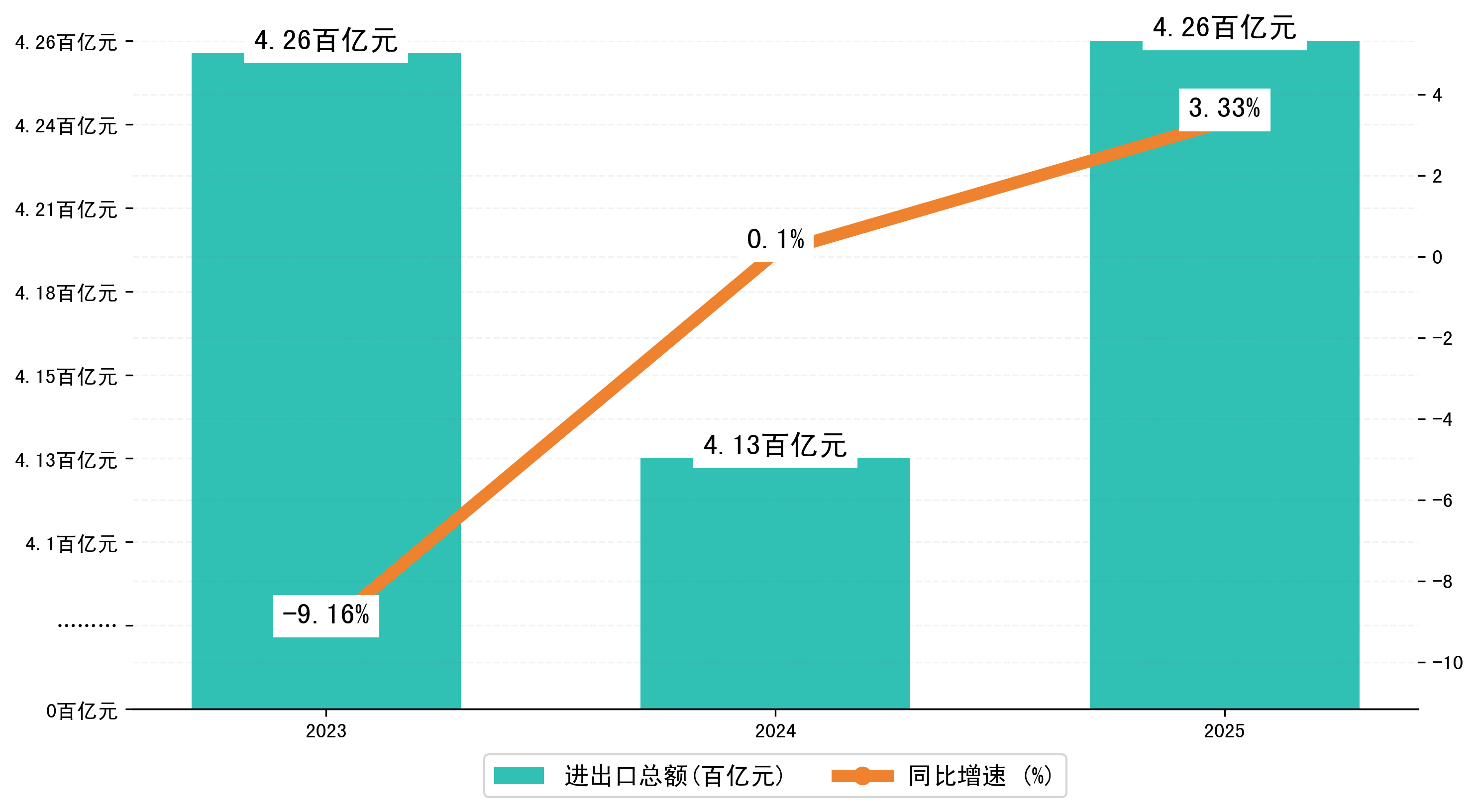 以人民币计,2025年1-5月淄博市进出口总额为426,3962.7077万元,相比上年同期增加了13,7561.4356万元,同比增加了1.40%。