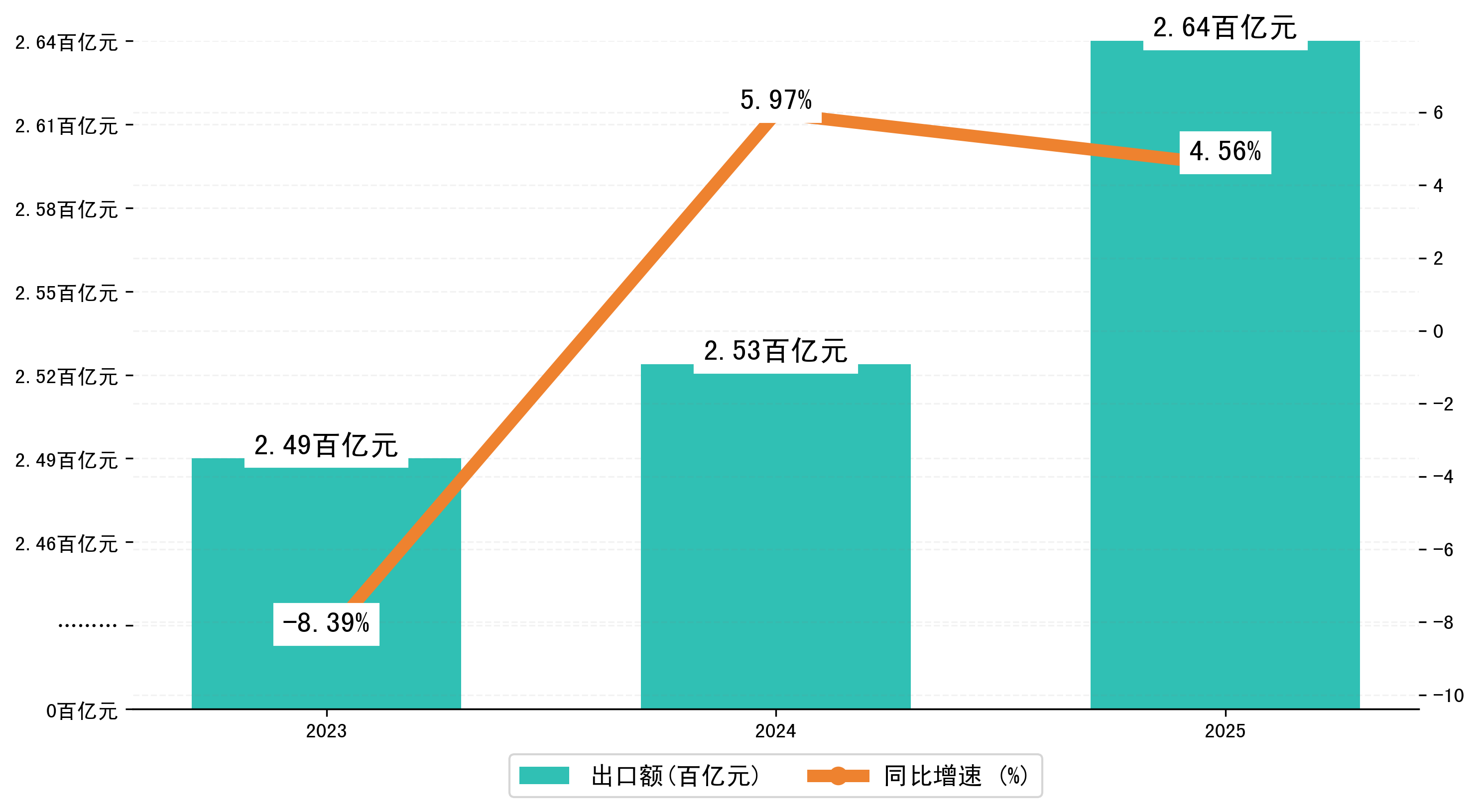 以人民币计,2025年1-5月淄博市出口额为264,1239.5859万元,相比上年同期增加了11,5134.9652万元,同比增加了4.60%。
