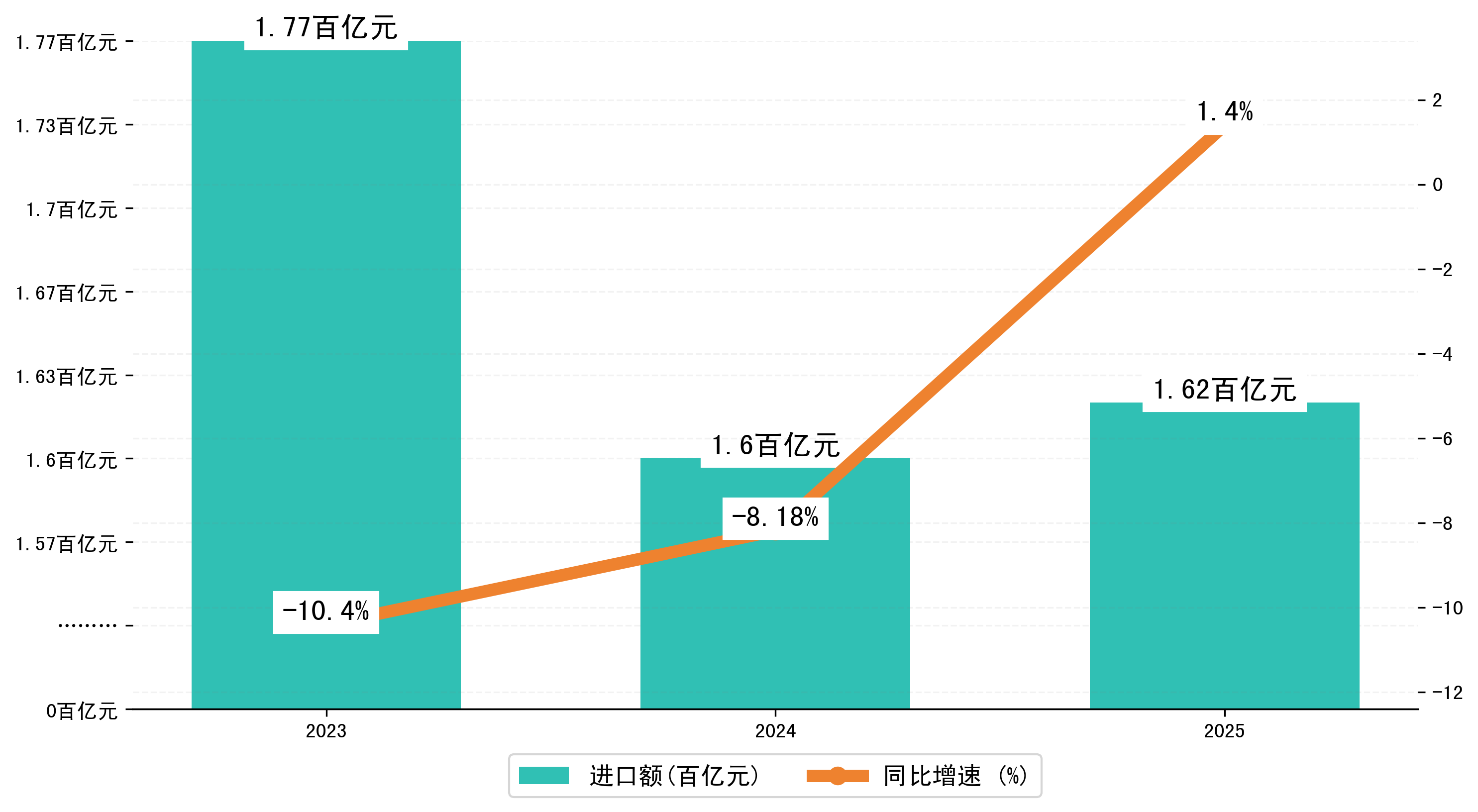 以人民币计,2025年1-5月淄博市进口额为162,2723.1218万元,相比上年同期增加了2,2426.4704万元,同比减少了-3.40%。
