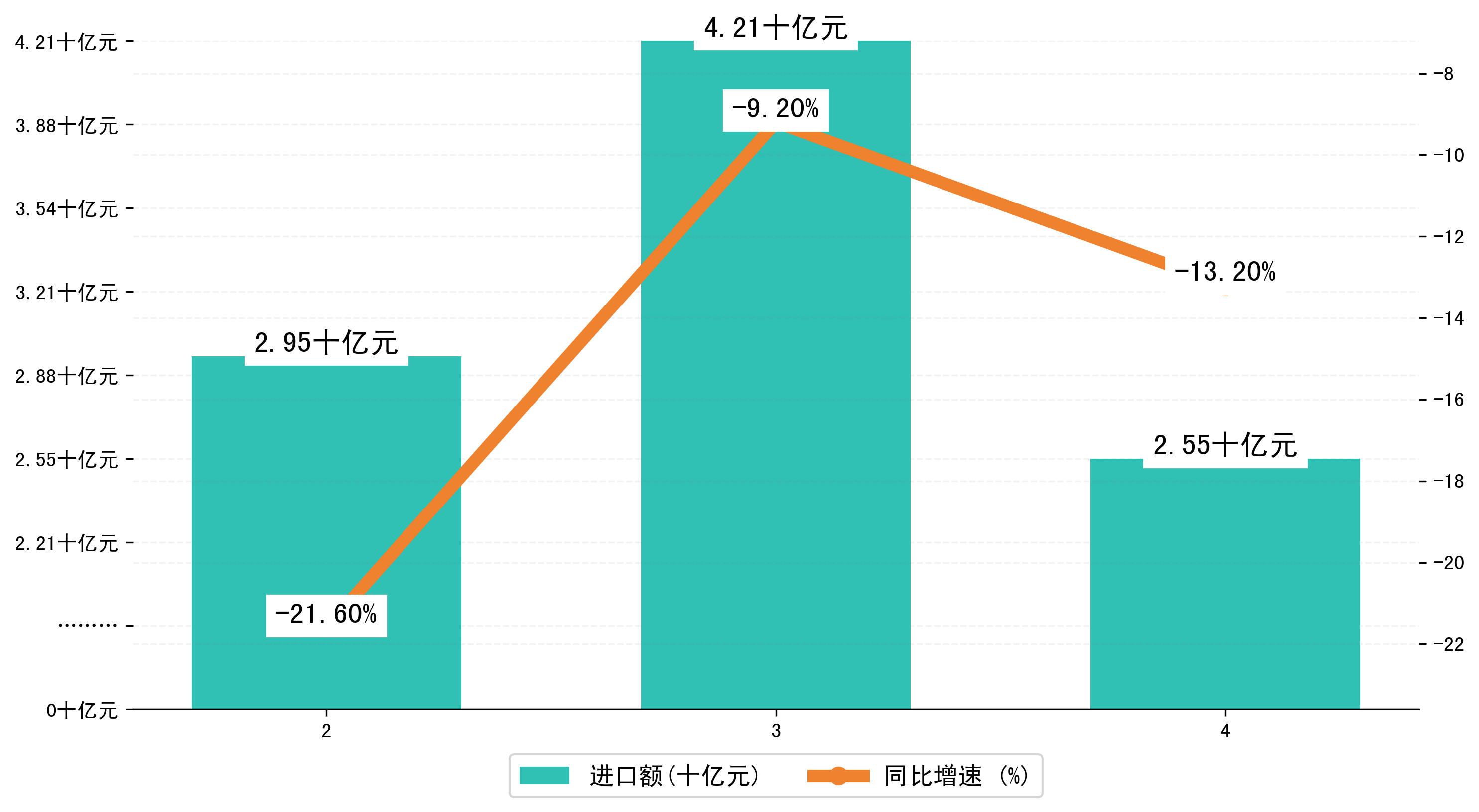 以人民币计,2025年1-4月淄博市进口额为127,7001.4111万元,相比上年同期减少了12,0006.0168万元,同比减少了-13.20%。