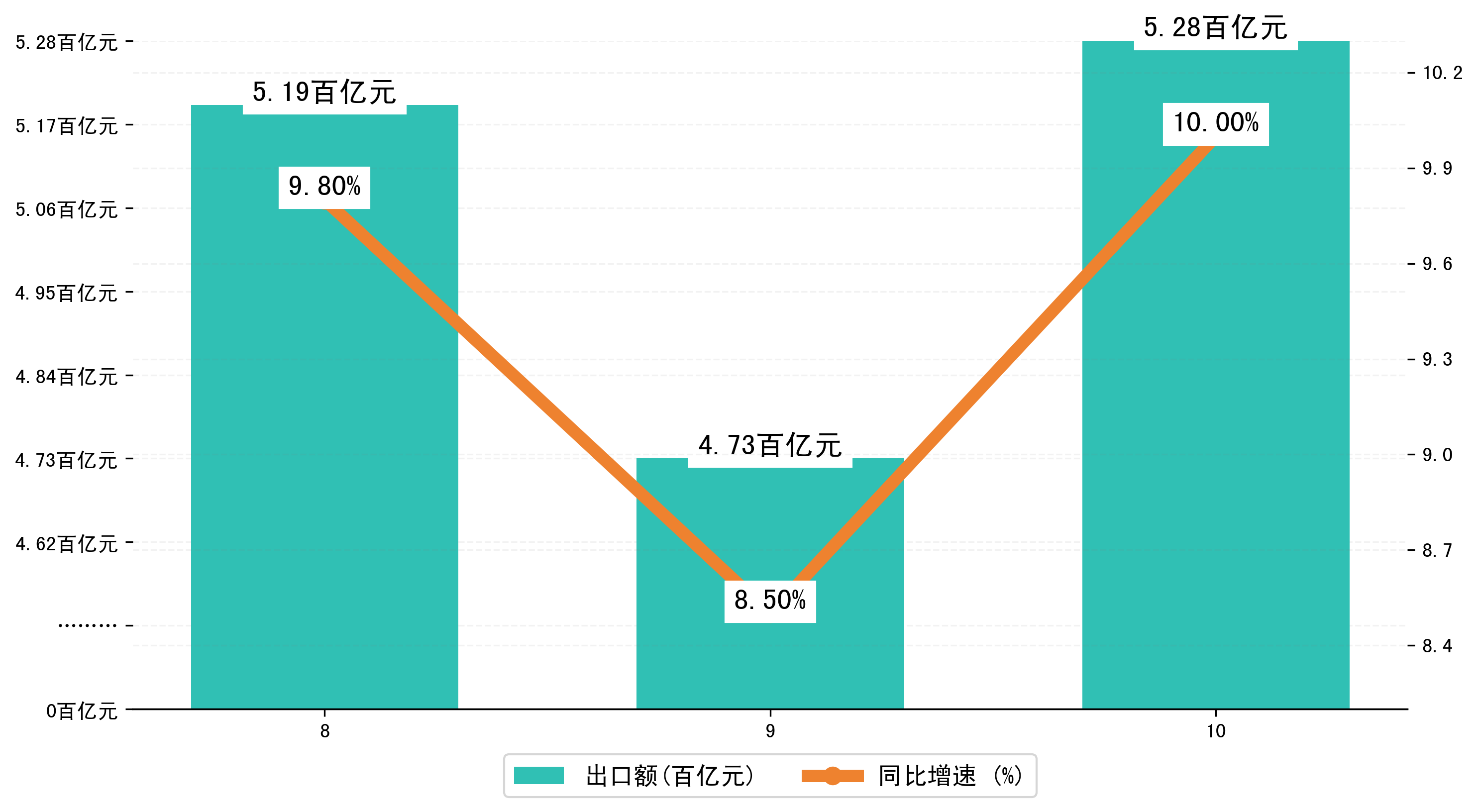 以人民币计,2024年10月安徽省出口额为527,8263.2527万元,相比上月增加了54,7063.1317万元;相比上年同期增加了97,7317.2363万元,同比增加了10.00%。