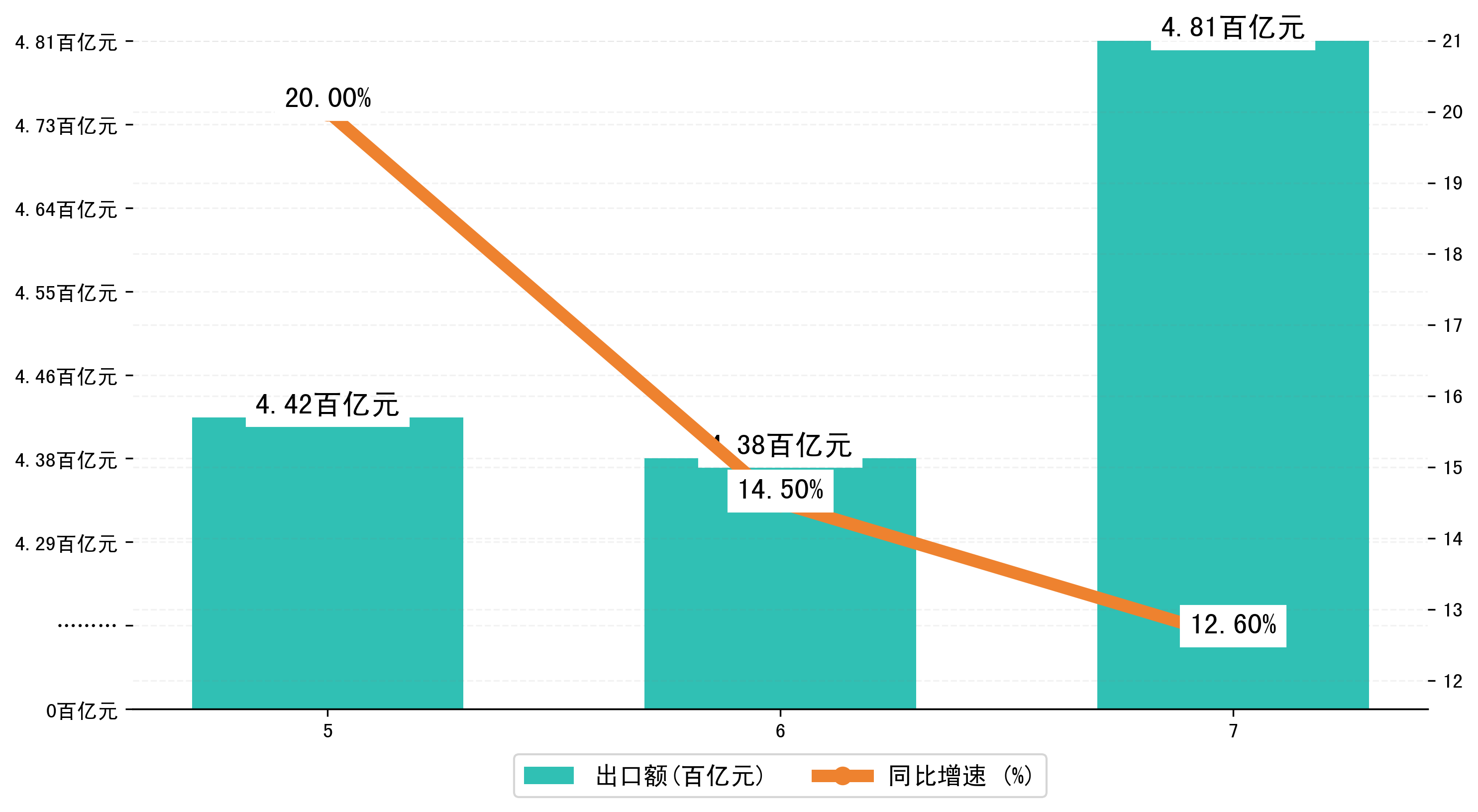 以人民币计,2023年7月安徽省出口额为481,4244.2811万元,相比上月增加了43,7735.1165万元;相比上年同期增加了15,1053.5694万元,同比增加了12.60%。