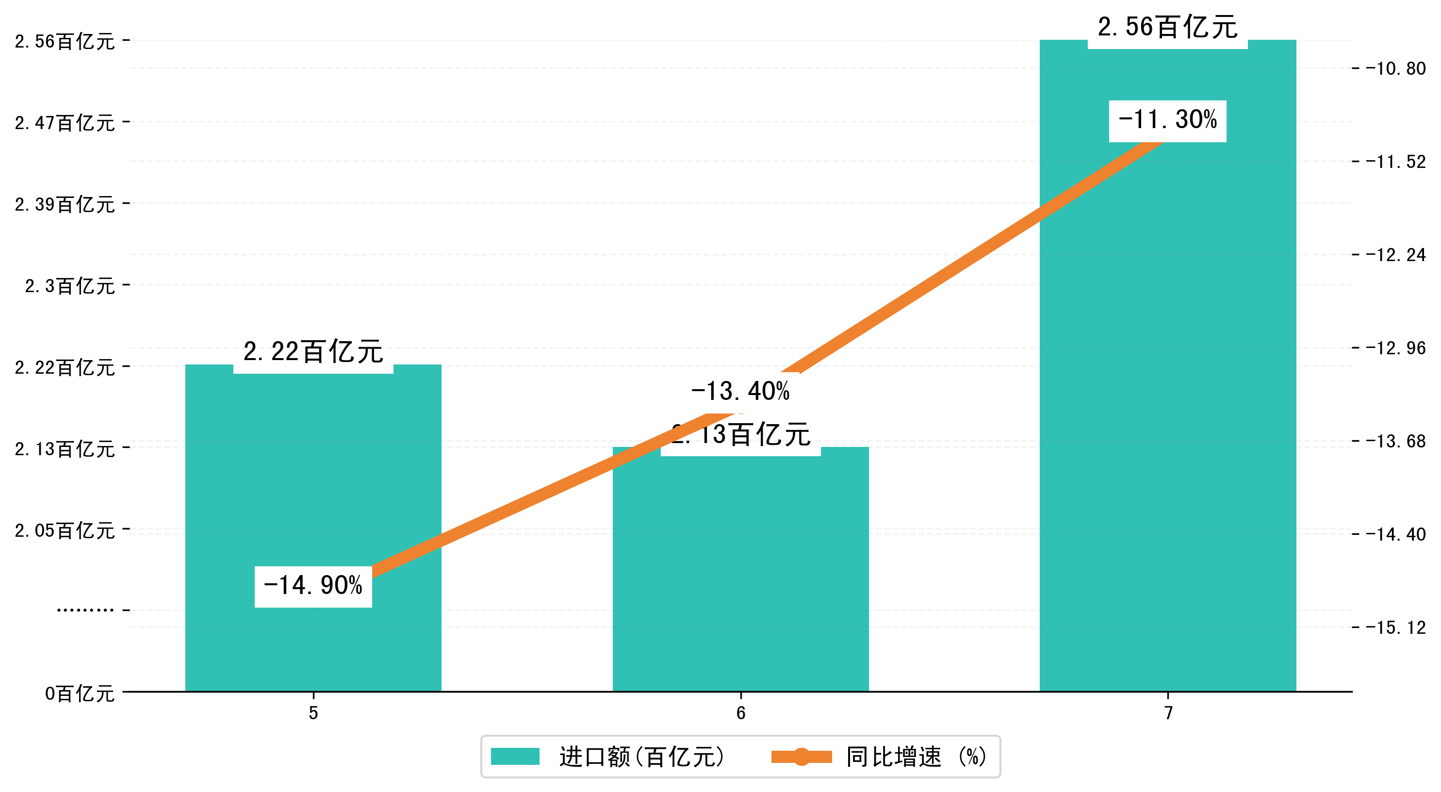 以人民币计,2023年7月安徽省进口额为255,7920.8864万元,相比上月增加了42,5319.7072万元;相比上年同期减少了9,7810.1326万元,同比减少了-11.30%。