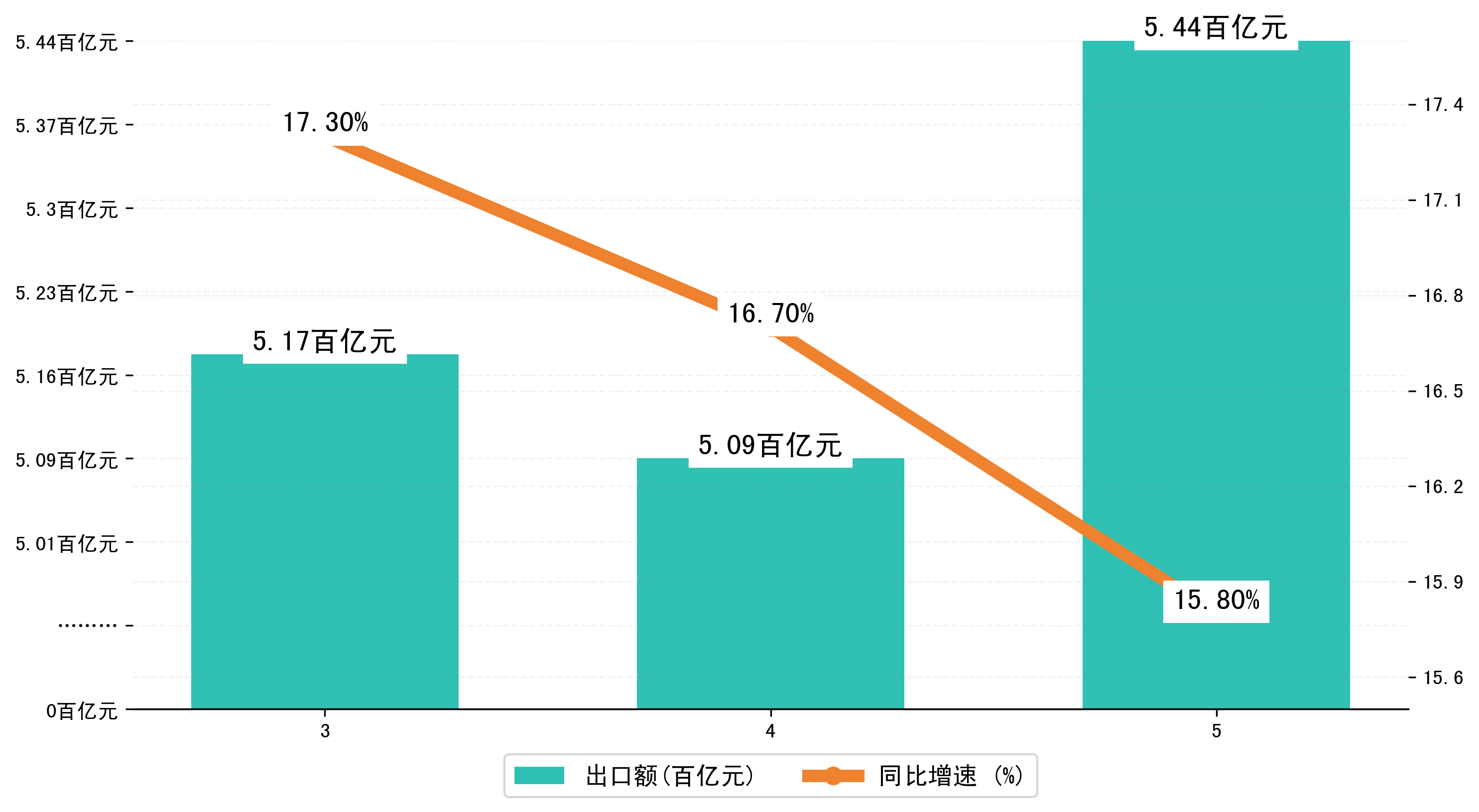 以人民币计,2025年5月安徽省出口额为544,3506.5857万元,相比上月增加了35,8253.6988万元;相比上年同期增加了62,3988.4439万元,同比增加了15.80%。