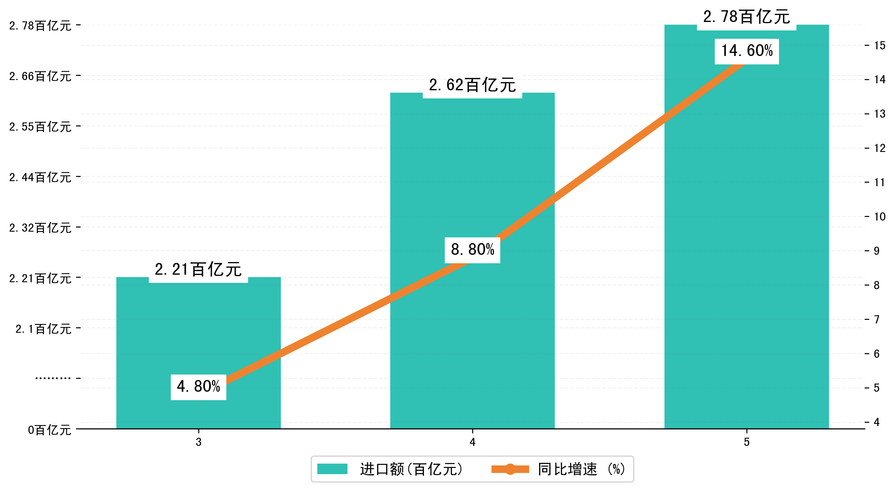 以人民币计,2025年5月安徽省进口额为277,7361.2476万元,相比上月增加了15,3479.8621万元;相比上年同期增加了79,6676.1449万元,同比增加了14.60%。