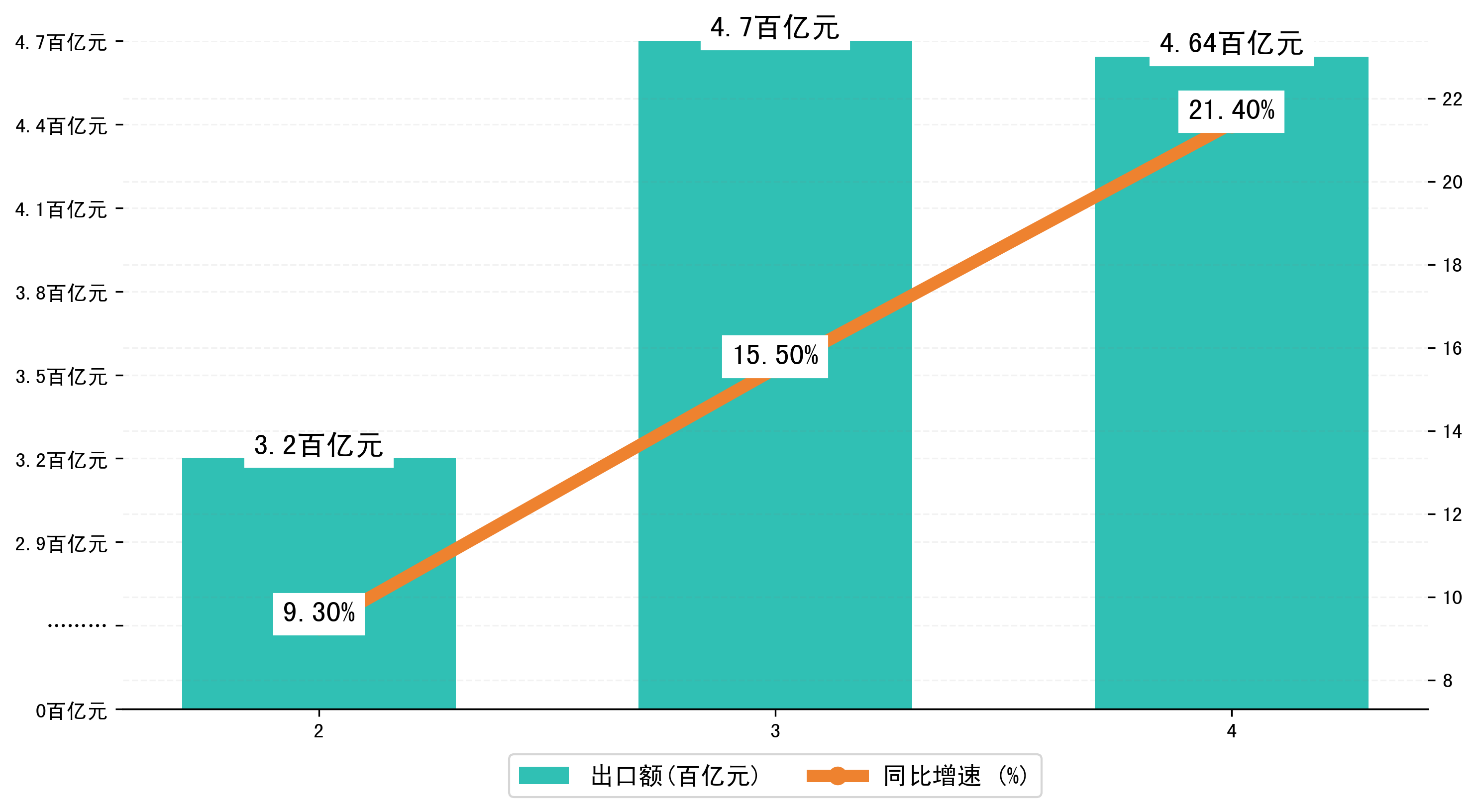 以美元计,2023年1-4月安徽省出口额为239,7943.412万美元,相比上年同期增加了26,2959.4178万美元,同比增加12.50%。