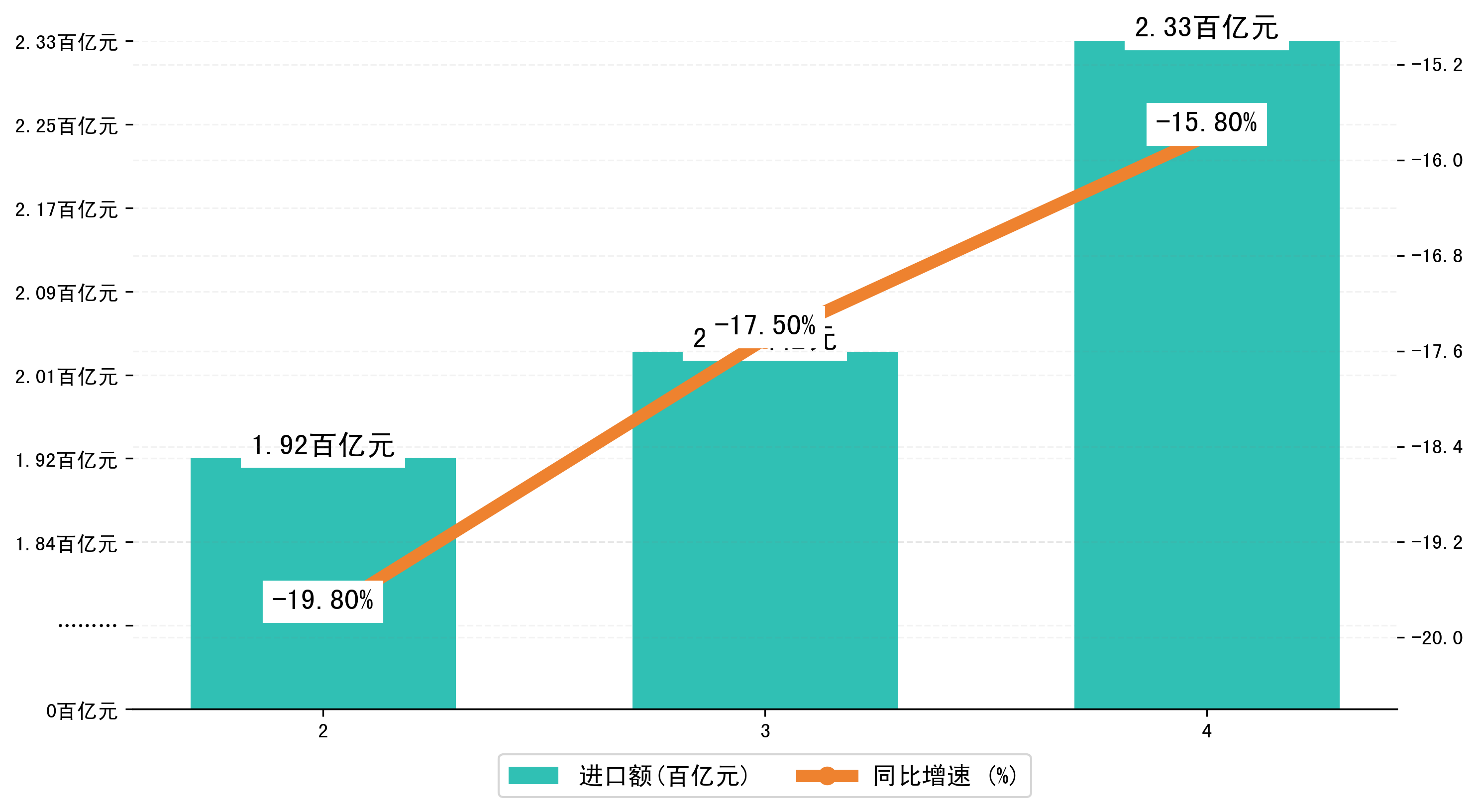 以美元计,2023年1-4月安徽省进口额为120,0143.4295万美元,相比上年同期减少了32,7428.0235万美元,同比减少-21.90%。