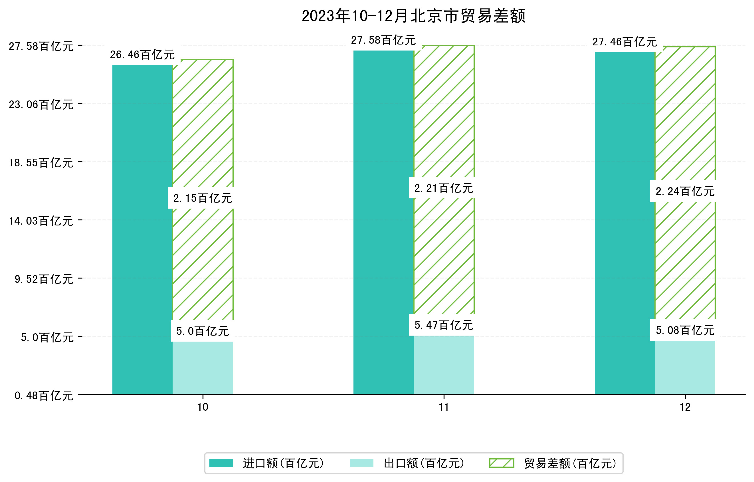 以美元计,2023年12月北京市贸易差额为312,2202,6108万美元(贸易逆差),相比上月减少了4,2790,4549万美元;相比上年同期减少了14,0136,9017万美元,同比减少4.7%。