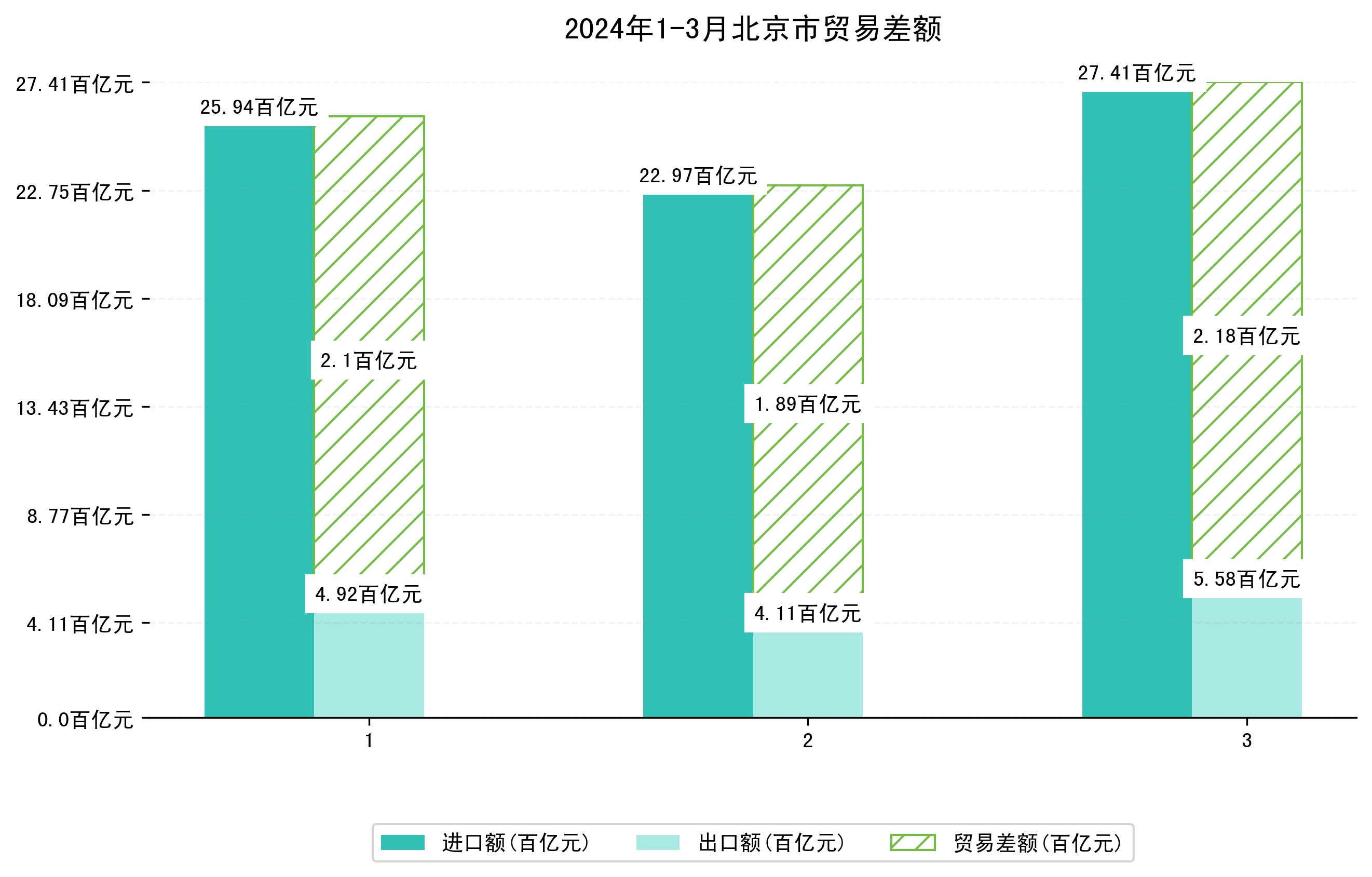 以美元计,2024年1-3月北京市贸易差额为869,7199,8699万美元(贸易逆差),相比上年同期减少了20,0684,8973万美元,同比减少2.36%。