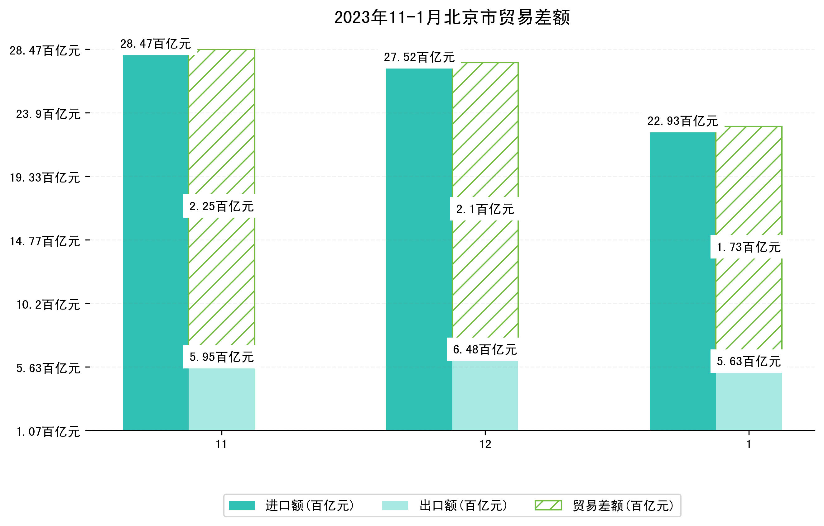 一、2023年1月北京市单月出口总额及进出口差额统计分析
