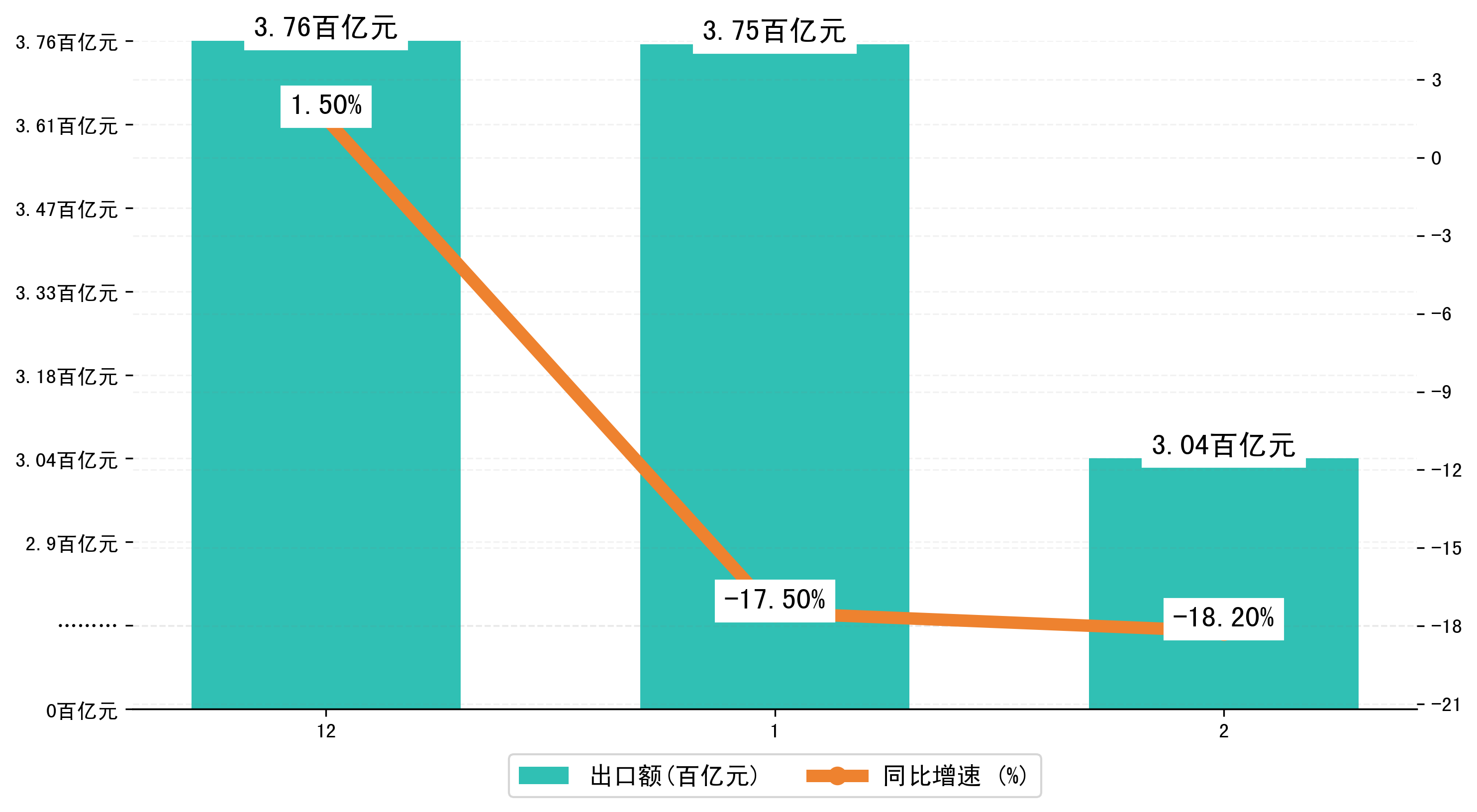 以人民币计,2023年2月重庆市出口额为304,0770.3722万元,相比上月减少了71,0908.3815万元;相比上年同期减少了71,6709.0145万元,同比减少了-18.20%。