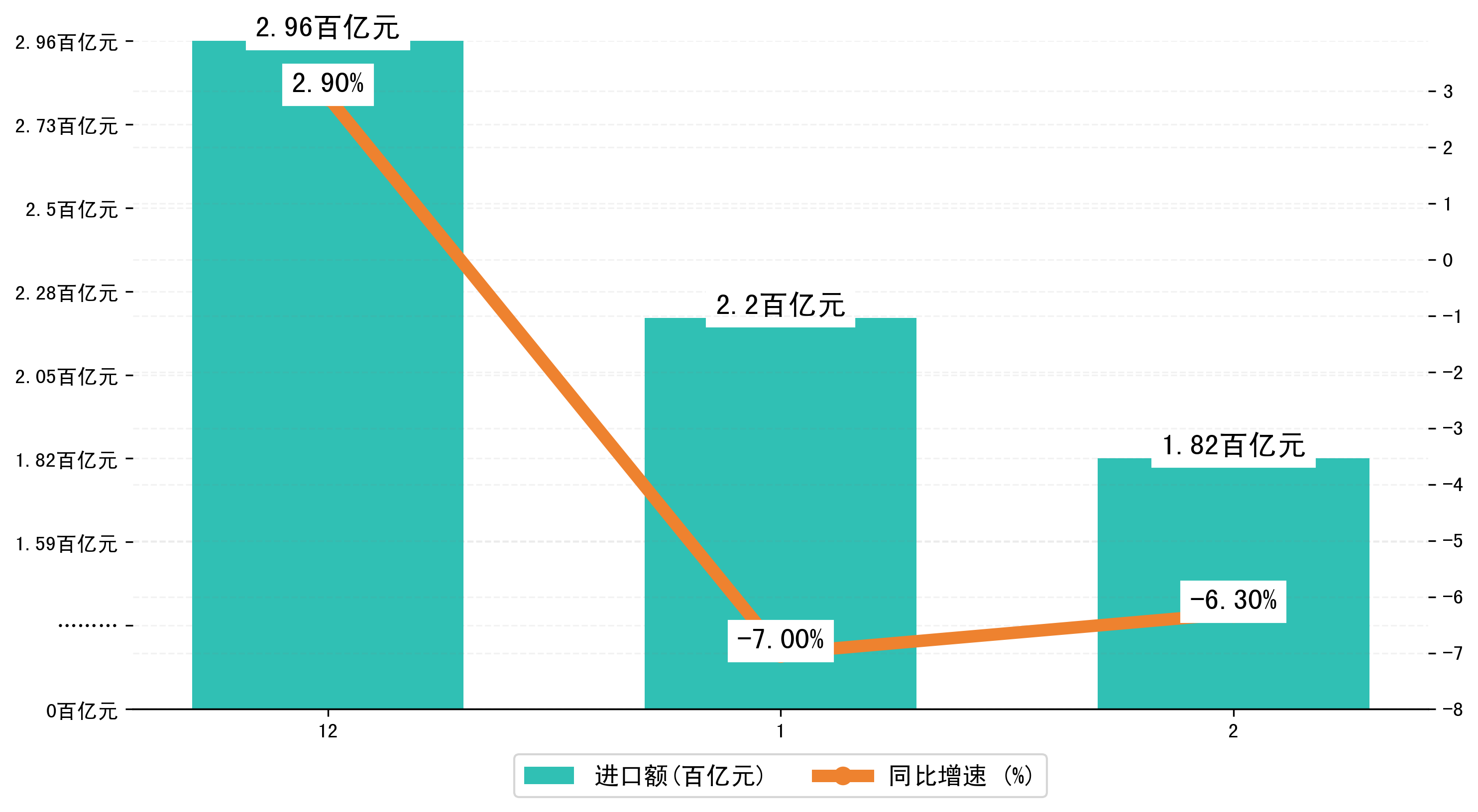 以人民币计,2023年2月重庆市进口额为181,7630.295万元,相比上月减少了38,5055.1812万元;相比上年同期减少了8,4712.4701万元,同比减少了-6.30%。