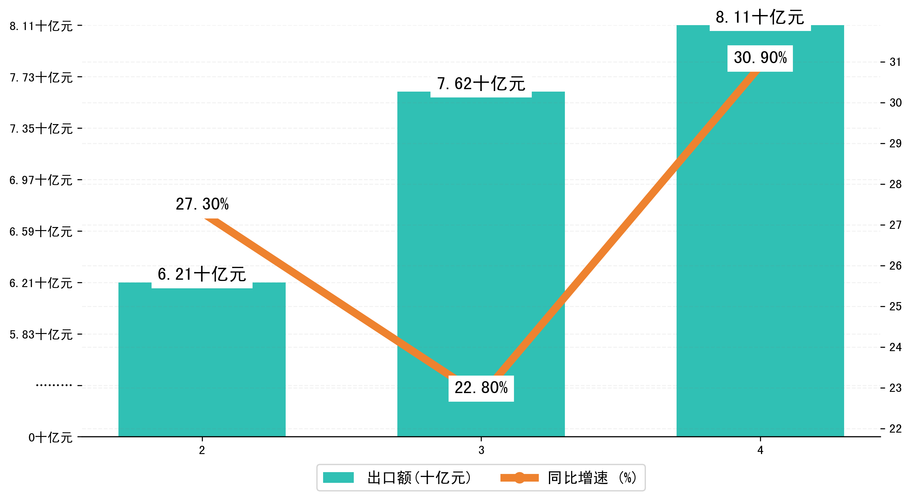 以美元计,2024年4月海南省出口额为11,4154.2855万美元,相比上月增加了6950.2862万美元;相比上年同期增加了3,6362.536万美元,同比增加26.60%。