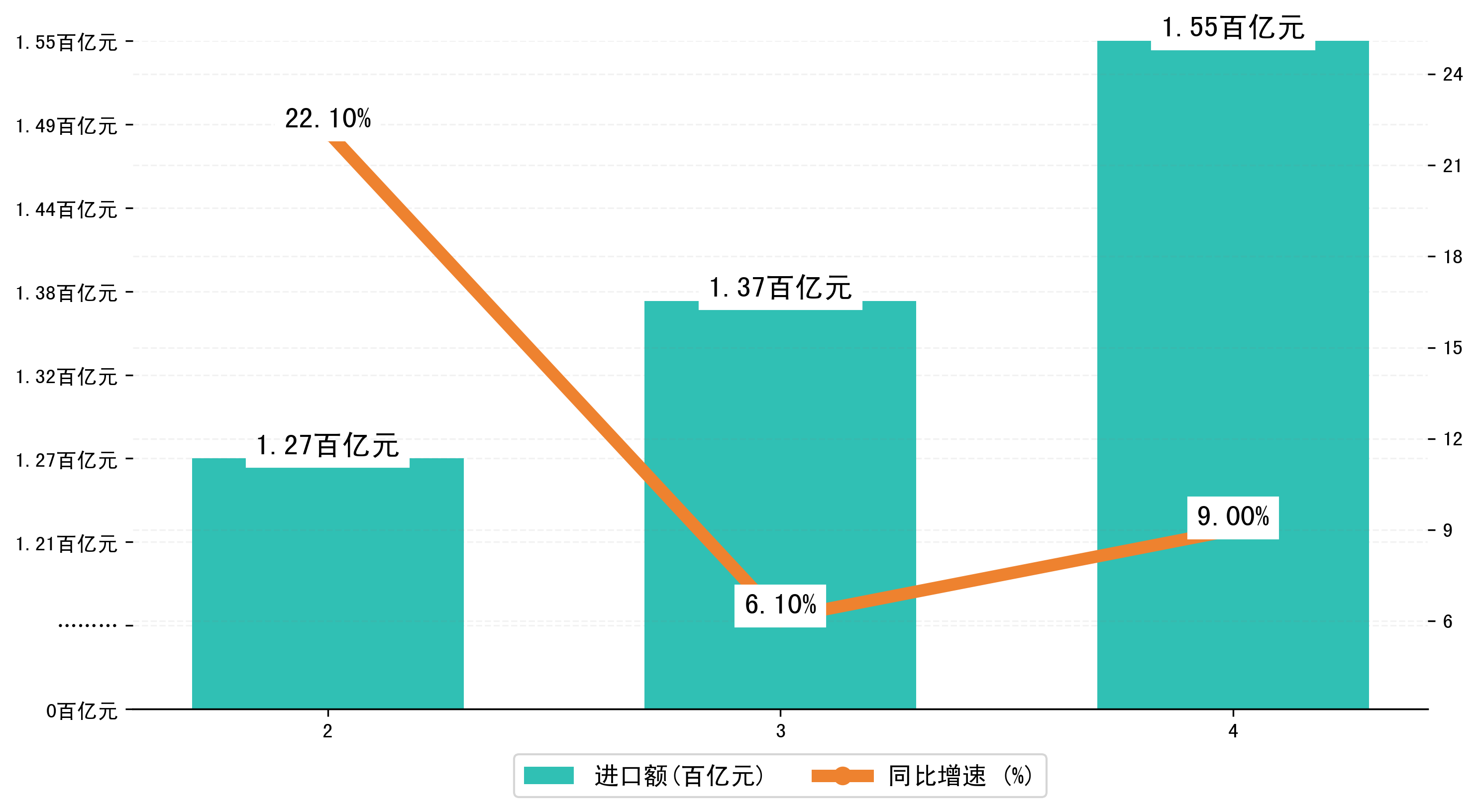 以人民币计,2024年4月海南省进口额为154,6887.0215万元,相比上月增加了17,3763.6805万元;相比上年同期增加了19,9531.9598万元,同比增加了9.00%。
