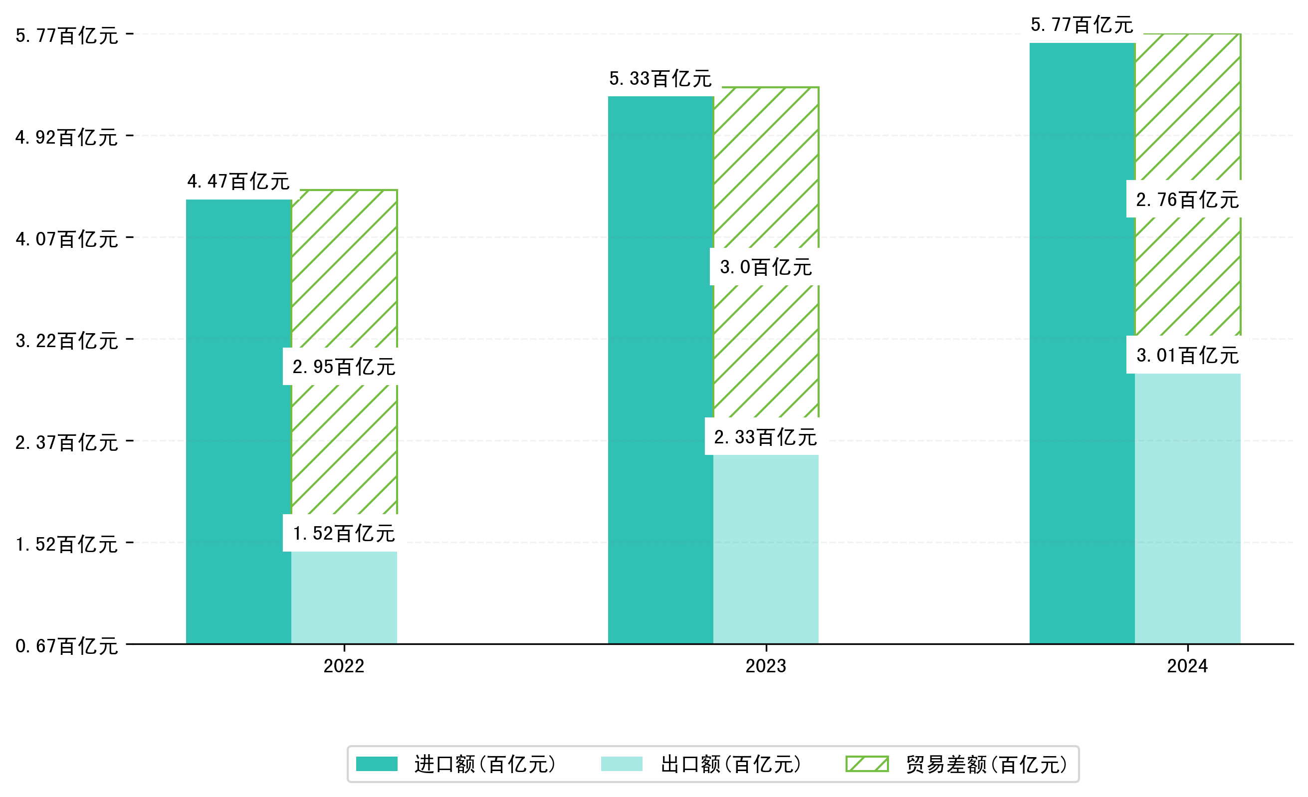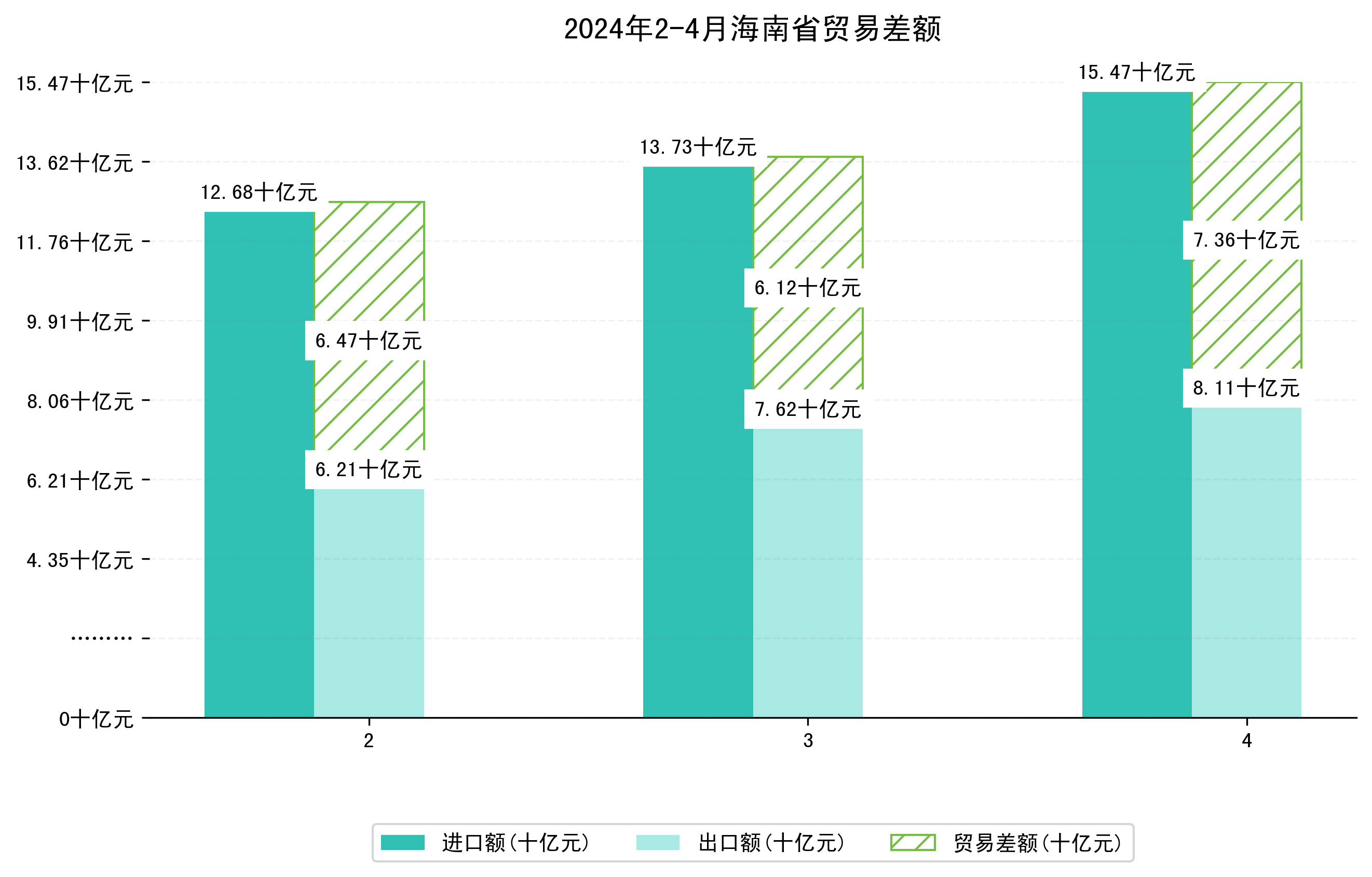 以人民币计,2024年1-4月海南省贸易差额为276,4589,1028万元(贸易逆差),相比上年同期增加了23,5845,6687万元,同比增加-7.86%。